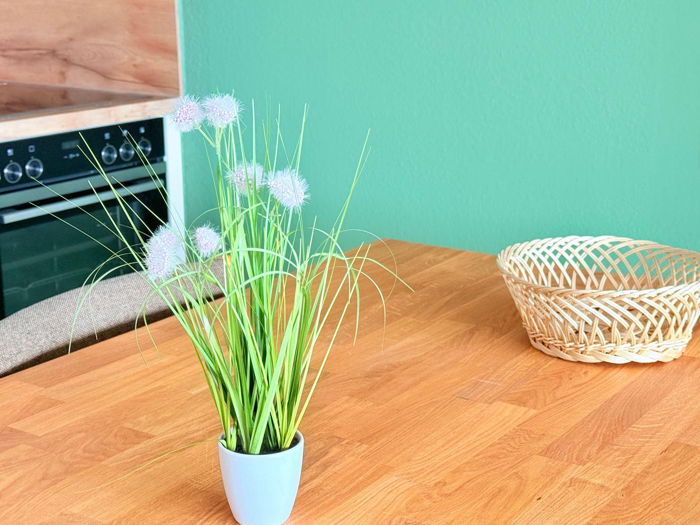 Die Wohnung hat ein schickes Duschbad, eine schöne Küchenzeile mit großen Esstisch, ein gemütliches Sofa