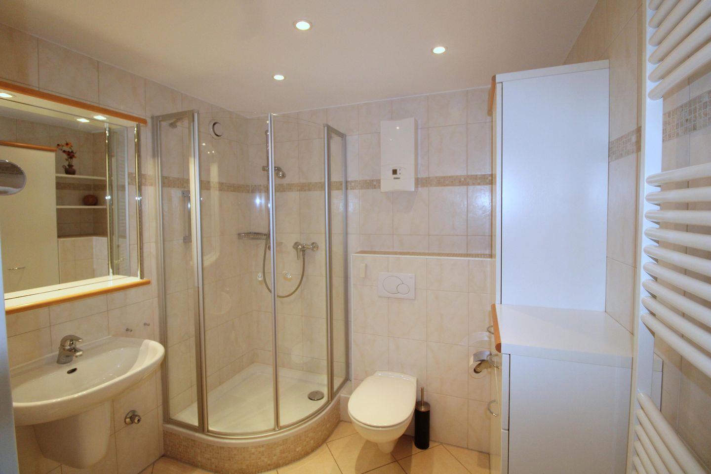 Das moderne Duschbad hat viele Ablagen und Schränke. Der helle Balkon hat eine ausfahrbare Markise und ist ca. 6 m lang.