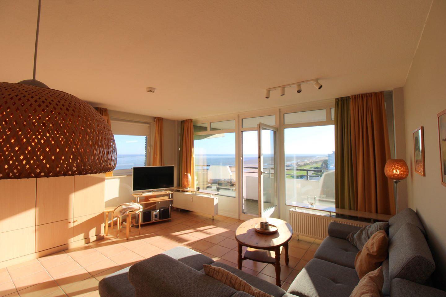 Die Panorama Whg 110 im 8. Stock bietet auf 47 m² einen außergewöhnlich guten Meerblick, einen überdachten Balkon, eine offene Küche und moderne Ausstattung. Genießen Sie den beheizten Outdoor-Pool, Sauna, Solarium und die erstklassige Lage direkt am Sandstrand von Cuxhaven. WLAN, Privatparkplatz und Aufzug sind vorhanden.