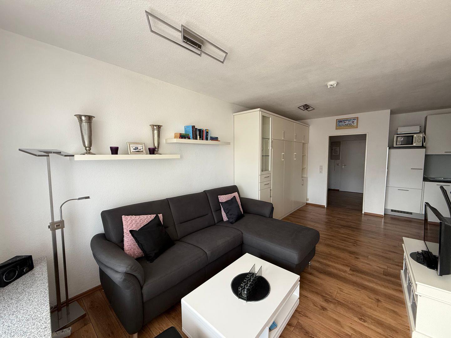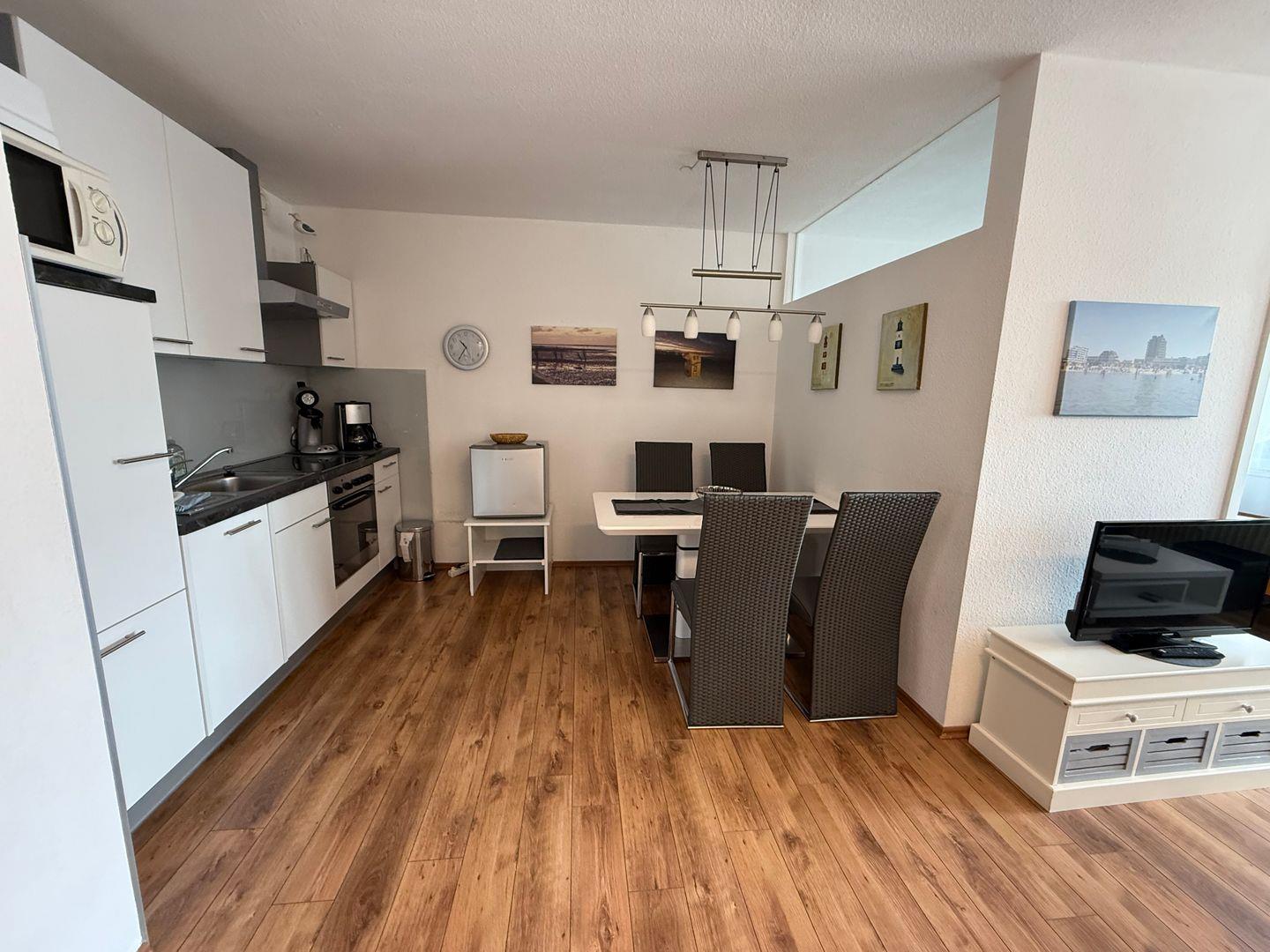 Die Wohnung ist bequem per Aufzug erreichbar und modern eingerichtet. Der helle Wohn- und Essbereich verfügt über digitales Kabel-TV, HiFi-Anlage und Radio. Die offene Küche ist vollständig ausgestattet mit Ceranherd, Backofen, Spülmaschine, Mikrowelle, Kühlschrank mit zusätzlichem Mini-Gefrierschrank, Senseo Pad-Maschine, Filterkaffeemaschine, Wasserkocher, Toaster sowie Küchenutensilien. Ein Esstisch ist vorhanden.