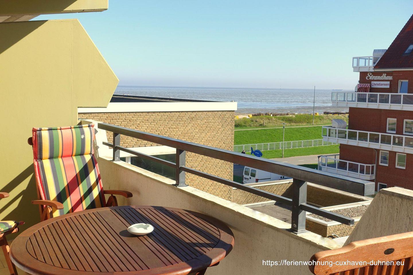 Die Panorama-Wohnung 42 im 2. Obergeschoss liegt in gefragter Lage in der Duhner Strandstraße 2 in Cuxhaven, nur ca. 30 Meter vom feinen Sandstrand und rund 50 Meter vom Meer entfernt.