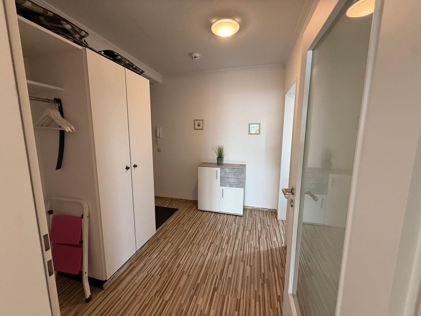 Die Wohnung verfügt über zwei Zimmer, darunter ein separates Schlafzimmer mit Laminatboden (allergikerfreundlich) und eigenem kleinen Balkon. Der Wohnbereich ist ebenfalls mit Laminatboden ausgestattet und bietet eine gemütliche Sofaecke mit bequemem Schlafsofa sowie einen zusätzlichen Sessel.