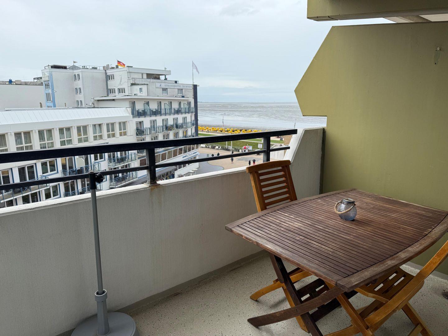 Vom Wohn- und Essbereich gelangen Sie auf den großen, überdachten Balkon mit Strandkorb und eingeschränkter Seesicht sowie Strandblick. Dank der Lage in erster Reihe sind es nur ca. 30 Meter bis zum feinen Sandstrand.
