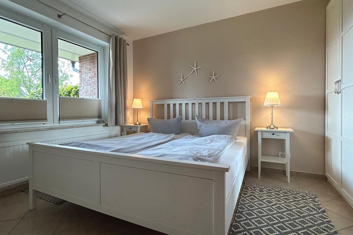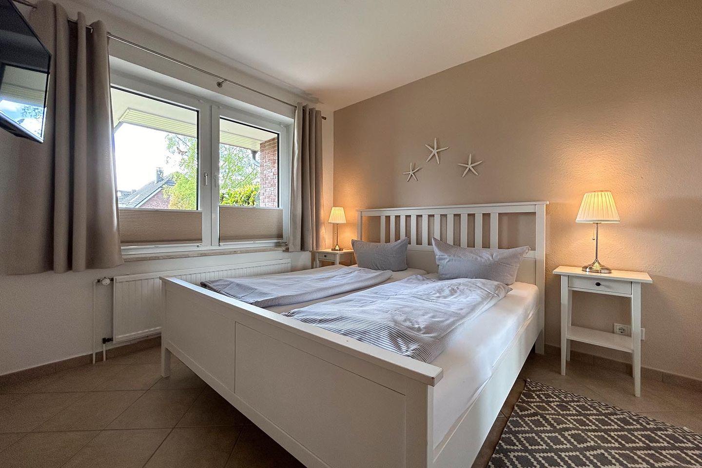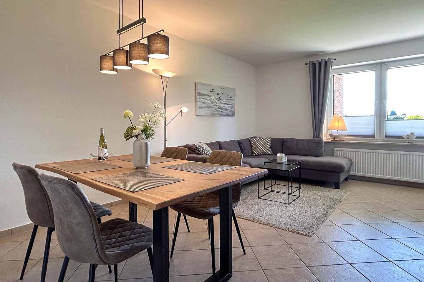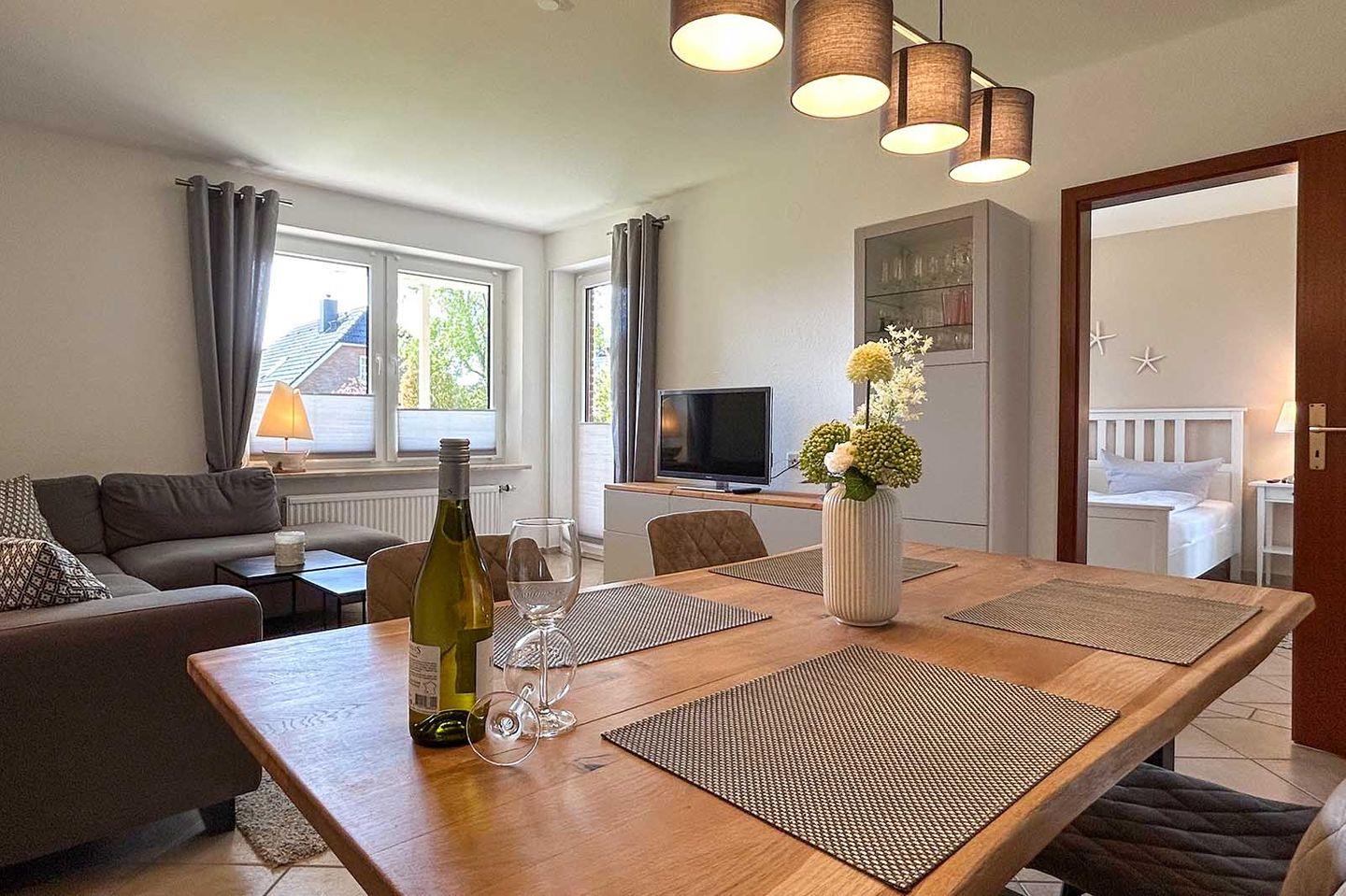 Die barrierefrei zugängliche Ferienwohnung ist mit teilüberdachter Terrasse und insgesamt 80 qm Wohnfläche für bis zu 4 Personen geeignet. Die Schlafräume sind sehr geschmackvoll eingerichtet und dekoriert, die moderne Küche mit kleinem Essplatz ist für die Verköstigung im Urlaub umfassend ausgestattet.