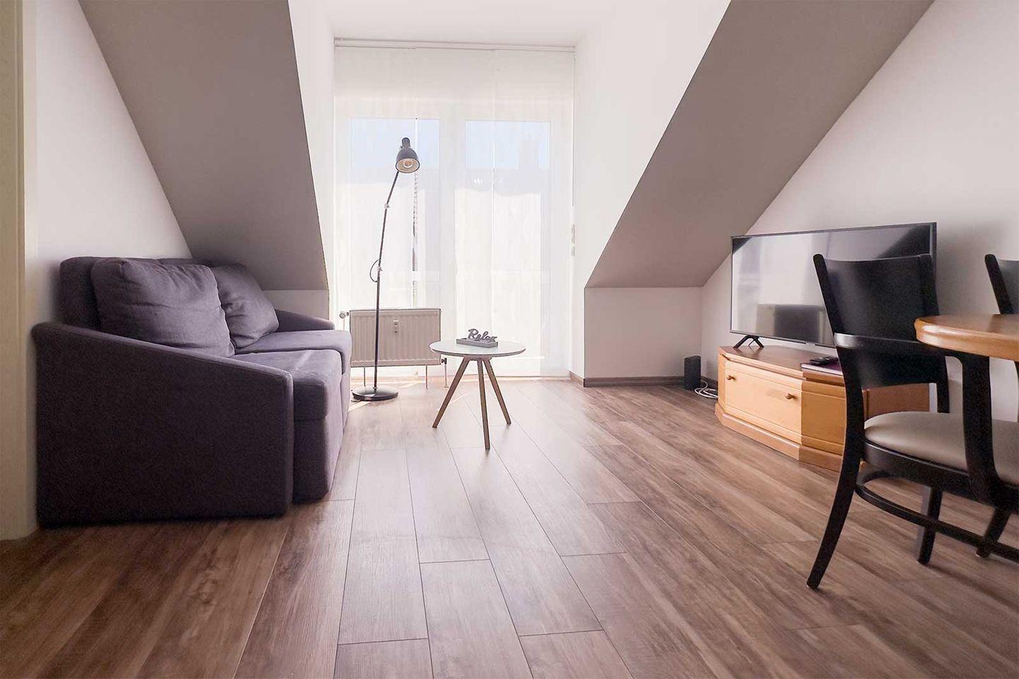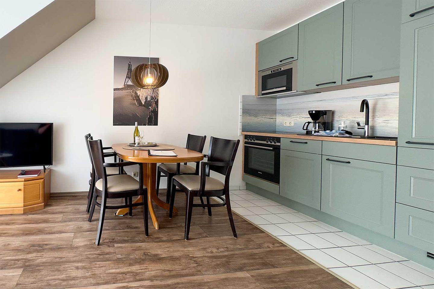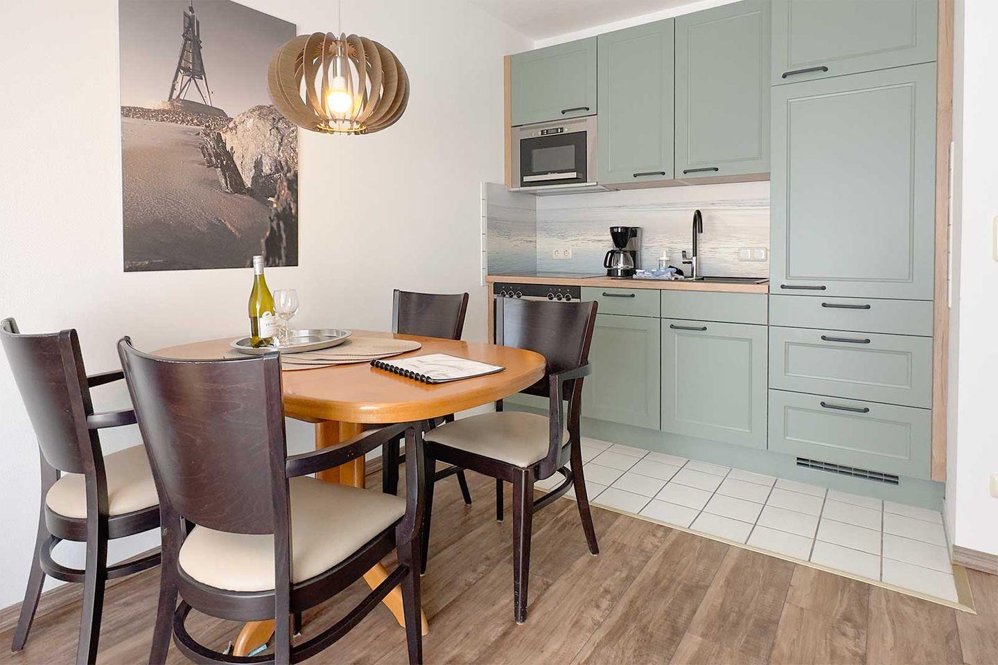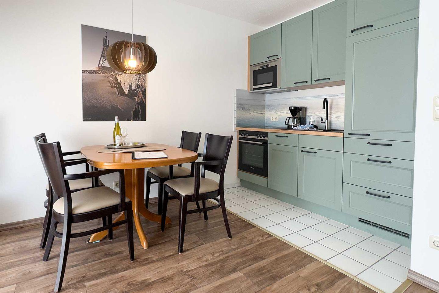 Komfortable Ferienwohnung mit zwei Schlafzimmern für maximal 4 Personen in der ersten Etage des Appartementhauses Seeadler in Duhnen. Der gemütliche Essplatz mit offener Küche zum Wohnraum und der Südbalkon laden zum entspannten Verweilen ein. W-LAN nutzen Sie in der Wohnung kostenfrei.