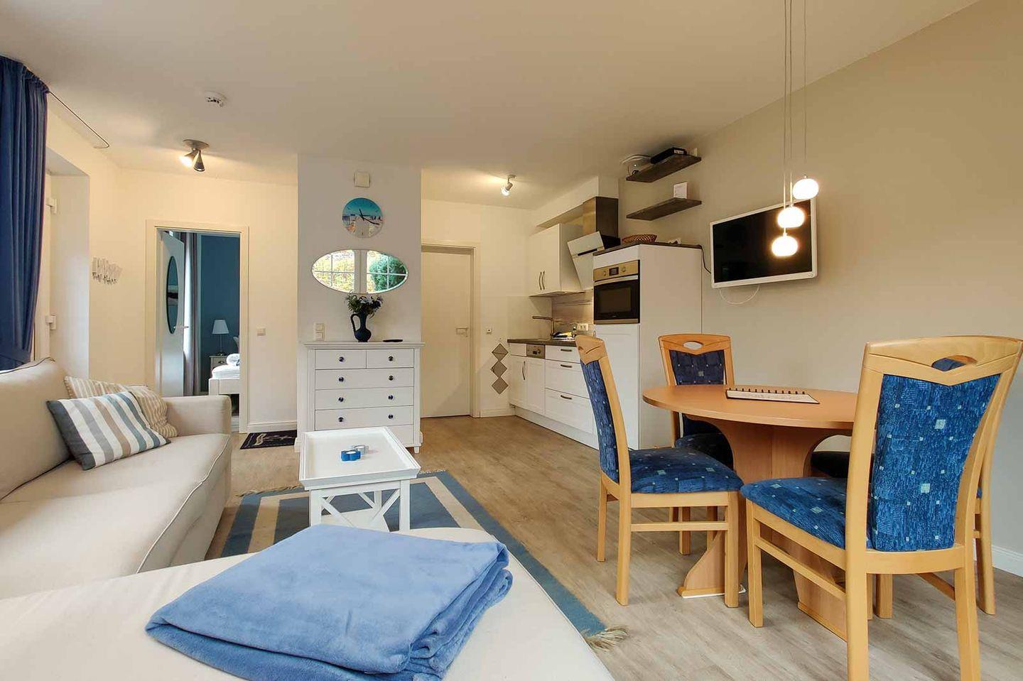 Die Unterkunft verfügt über ein helles Wohnzimmer, das zu geselligen Stunden einlädt. Hier finden Sie ein komfortables Sofa und einen Essbereich, an dem Sie gemeinsam speisen und entspannen können. Auch ein Fernseher mit Kabelanschluss sorgt dafür, dass Sie an gemütlichen Abenden Unterhaltung genießen können. Die offene Küche ist voll ausgestattet und bietet Ihnen alle Annehmlichkeiten, die Sie benötigen: von einem Cerankochfeld über einen Backofen bis hin zu einer Spülmaschine. So können Sie Ihre Lieblingsgerichte einfach zubereiten.