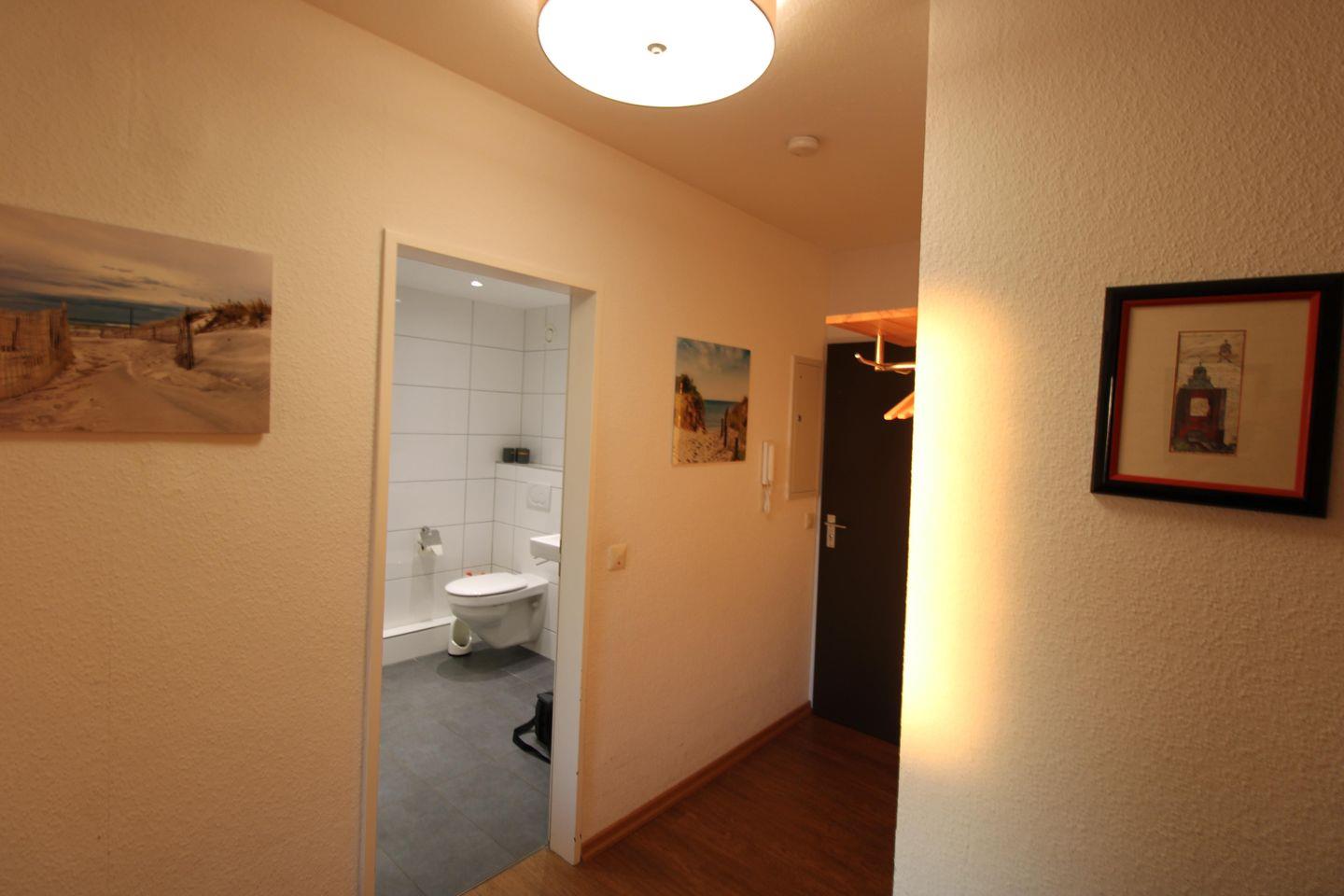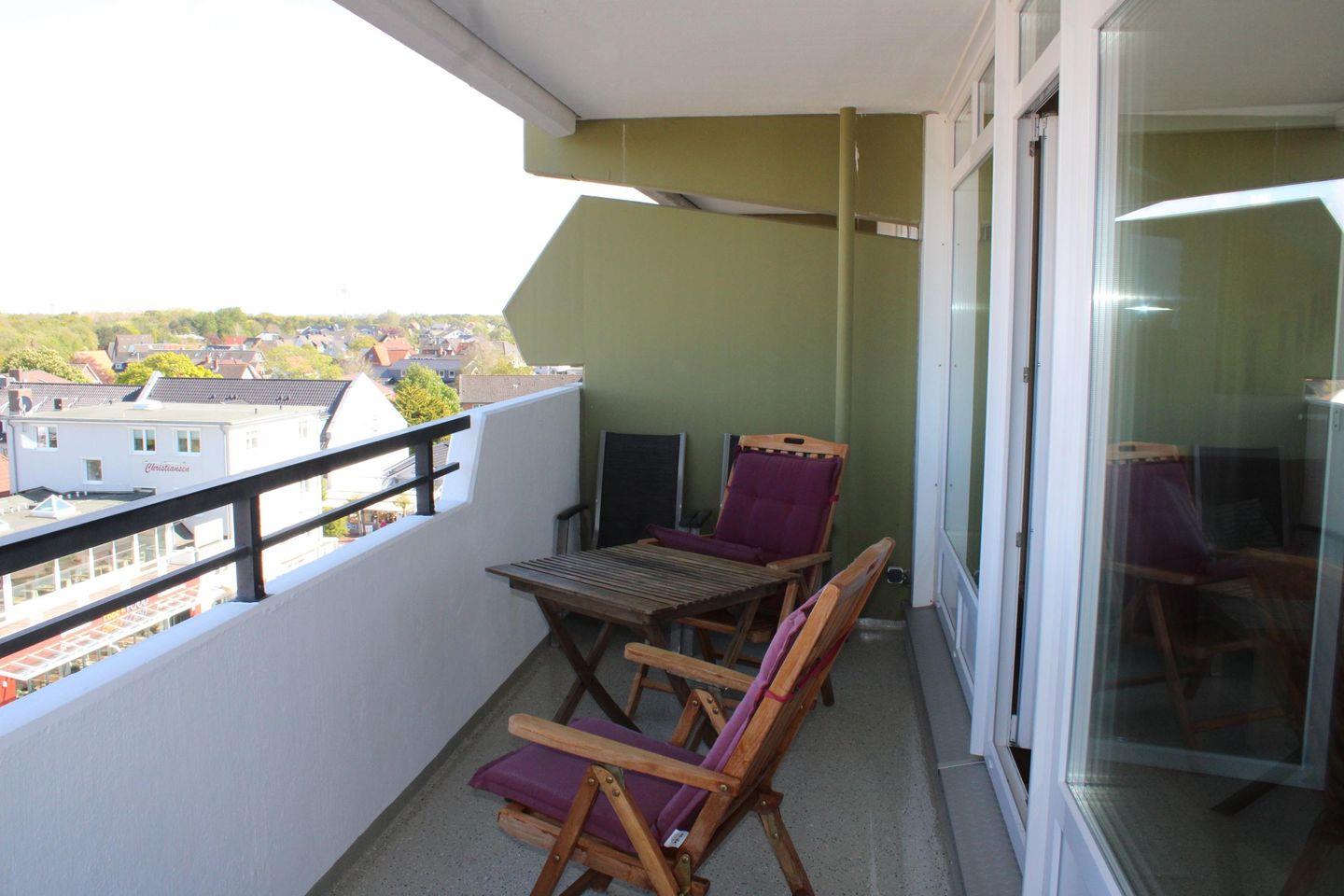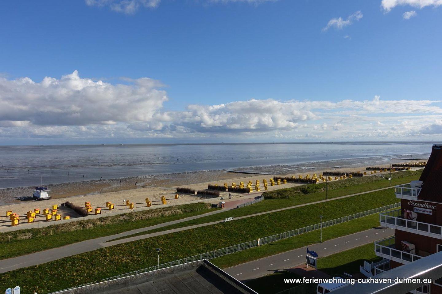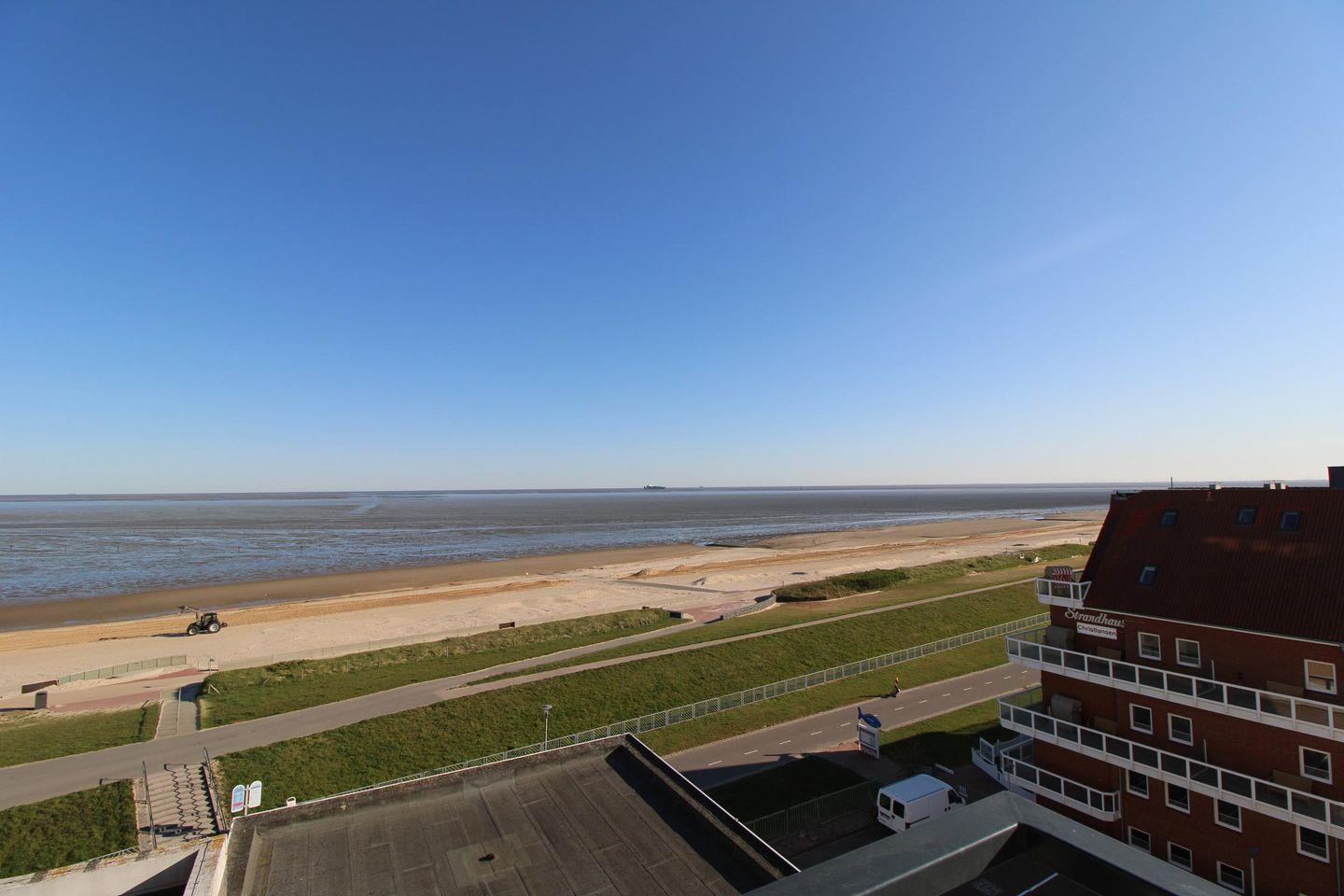 Die Ferienwohnung Nr.77 (48qm) liegt im 5.OG. mit Blick Richtung Osten zur Elbmündung und da sie eine Eckwohnung ist, kann man auch über den Deich in Richtung Norden sehen.