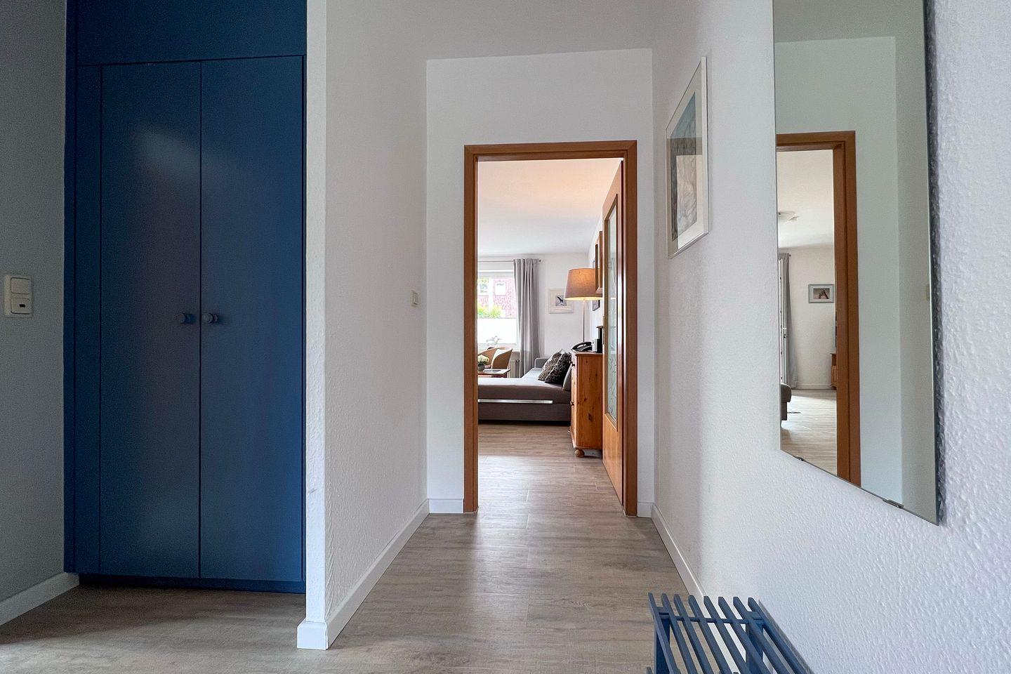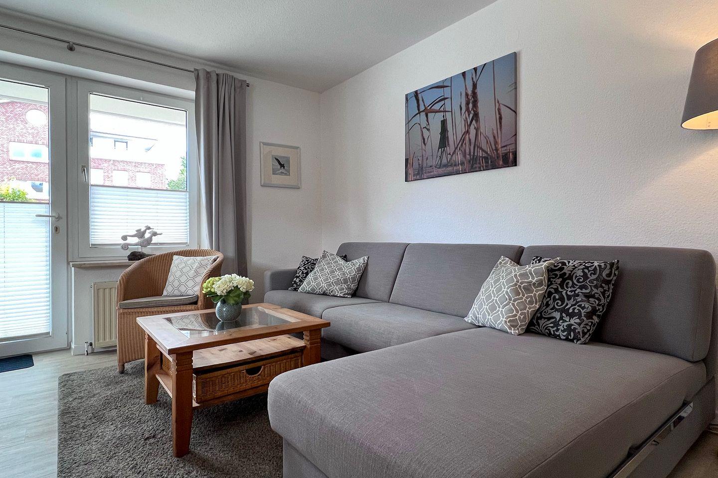 Die Wohnung verfügt über ein einladendes Schlafzimmer mit Teppichboden, das eine ruhige Atmosphäre und erholsame Nächte bietet. Für zusätzlichen Komfort sind im Wohnzimmer gemütliche Sofas eingerichtet, die zum Verweilen und Entspannen einladen. Hier können Sie nach einem erlebnisreichen Tag oder einem langen Strandaufenthalt die Zeit vor dem Fernseher verbringen, denn die Ferienwohnung ist mit zwei TV-Geräten ausgestattet. Zudem sorgt der CD-Spieler für musikalische Beschallung während Ihres Aufenthalts.