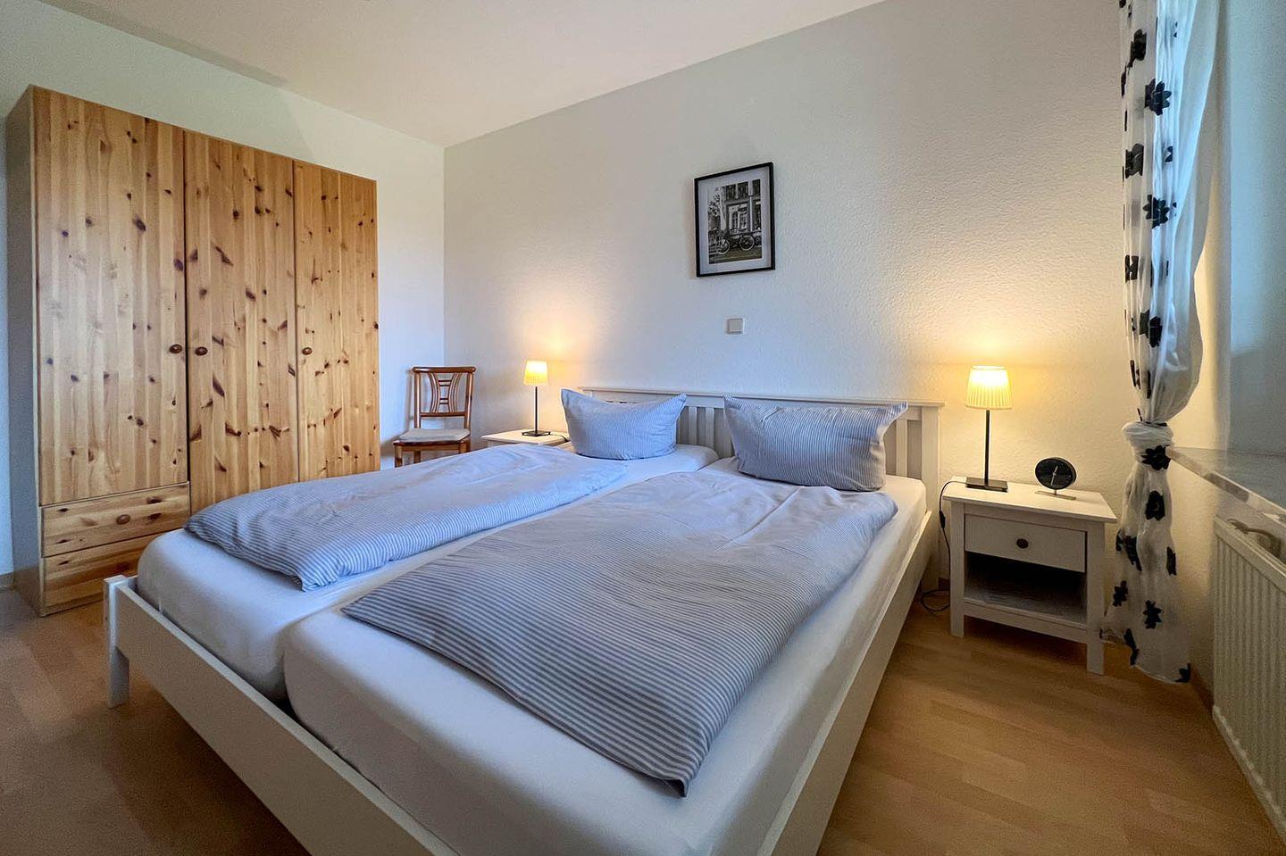 Die Landhaus Hubertus Ferienwohnung 11 bietet auf 68 m² Platz für bis zu vier Personen und überzeugt durch eine moderne Ausstattung, darunter eine voll ausgestattete geschlossene Küche, WLAN, ein bodengleiches Duschbad sowie eine überdachte Terrasse mit Garten. Ein Privatparkplatz, Barrierefreiheit und die Nähe zum Sandstrand runden das Angebot ab.