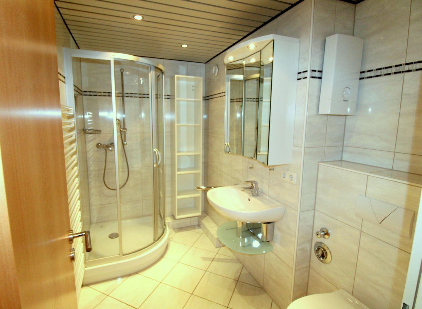 Das helle Duschbad hat eine halbrunde Dusche mit Eckeinstieg, "Handtuchtrocknerheizung" und ausreichend Regale für Handtücher, Kulturtasche usw.