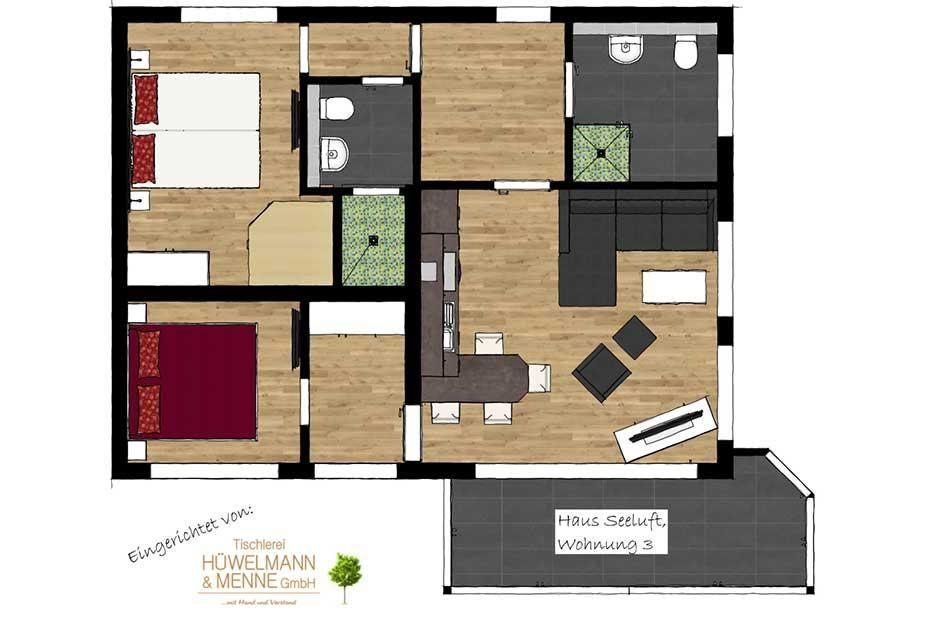 Die Haus Seeluft Ferienwohnung 3 (SL03) in Cuxhaven bietet Platz für bis zu sechs Personen auf 74 m², verteilt auf zwei Schlafzimmer und drei Zimmer insgesamt. Die Unterkunft verfügt über einen Wintergarten, einen überdachten Balkon mit Meer- und Strandblick, WLAN, eine moderne offene Küche und einen privaten Parkplatz. Nur 10 Meter trennen Sie vom feinen Sandstrand.