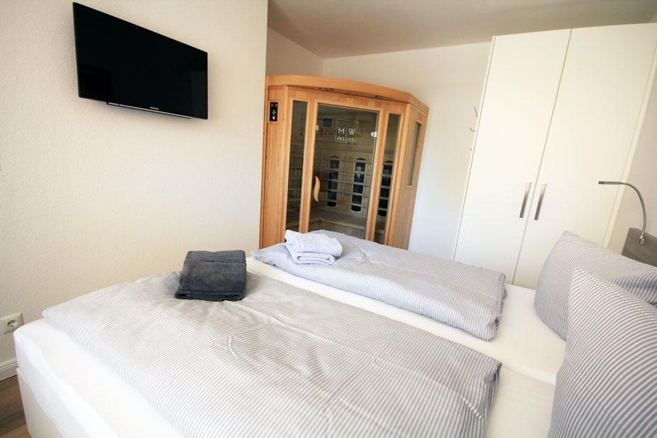 Die moderne Ferienwohnung punktet auf allen Ebenen. Im geschmackvoll eingerichteten Wohnraum befinden sich die offene Küche, der Essbereich und ein Schlafsofa. Von dort aus erreichen Sie den Wintergarten mit Meerblick. Zu beiden Schlafzimmern mit Doppelbett gehört auch ein Badezimmer mit Dusche. In einem der Schlafräume steht Ihnen außerdem eine Infrarotkabine (mit Münz-Automat) zur Entspannung zur Verfügung. WLAN nutzen Sie in der geräumigen Unterkunft kostenfrei.