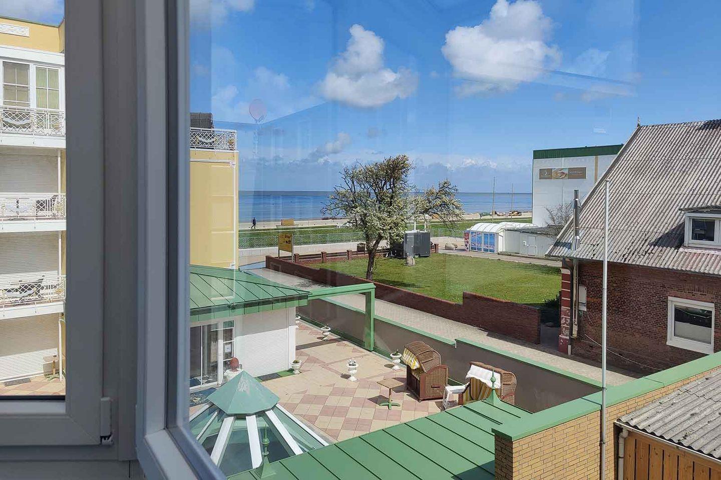 Große Ferienwohnung mit Balkon, Meerblick im Wintergarten und Wohnzimmer und eigenem Strandkorb am Strand während der Hauptsaison von Mai bis Mitte Oktober - strandnah und zentral in Duhnen.
