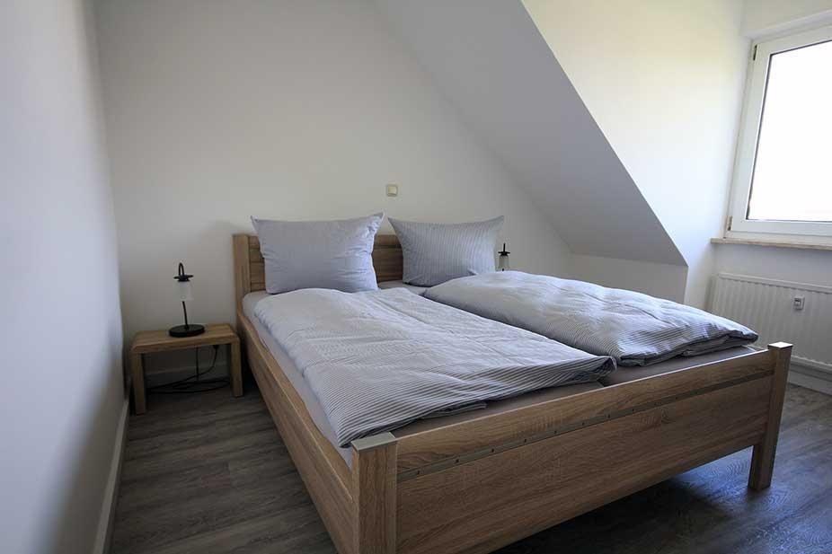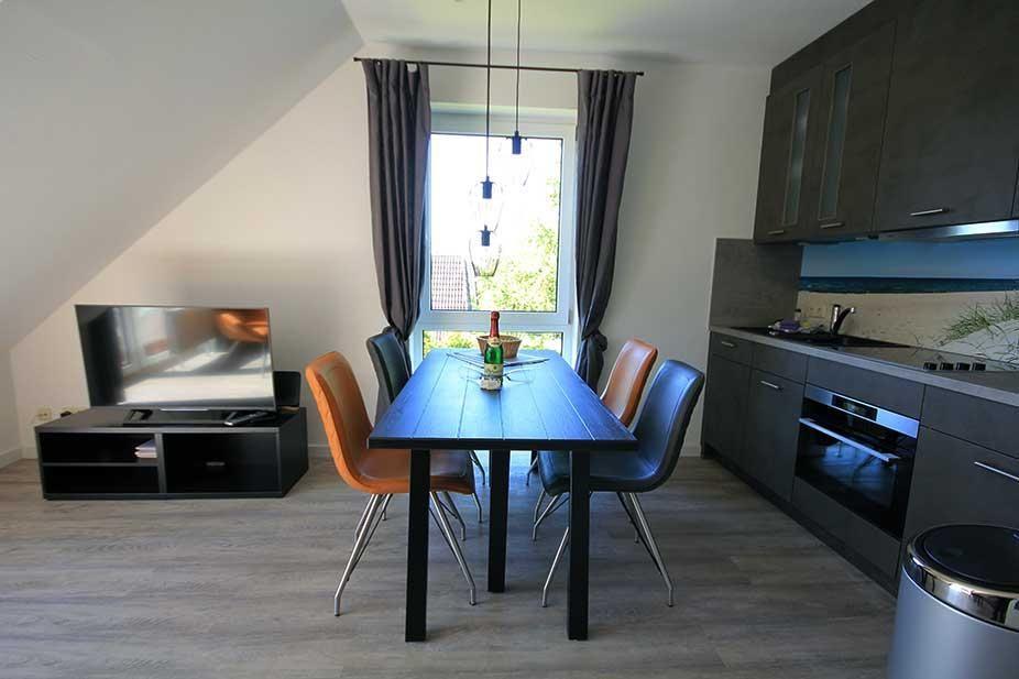 Geschmackvoll renoviertes Ferienappartement mit Wohnraum, moderner Küche und bequemen neuen Betten in der ersten Etage mit Südbalkon. Neben dem Schlafzimmer mit Doppelbett bietet die Schlafcouch mit eigener Matratze (140 x 200 cm) zwei weitere Übernachtungsmöglichkeiten.