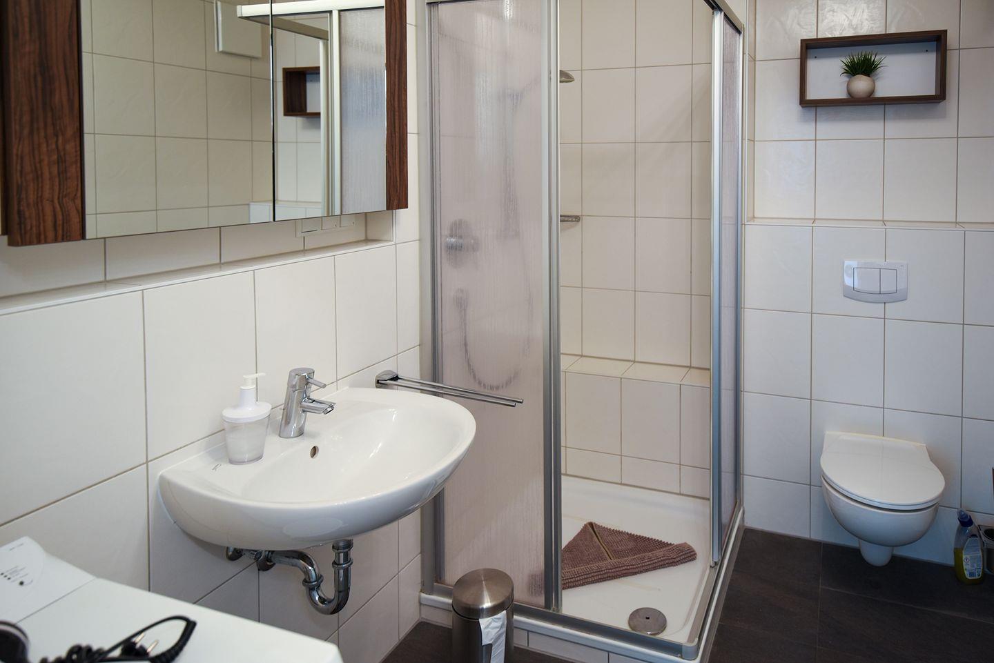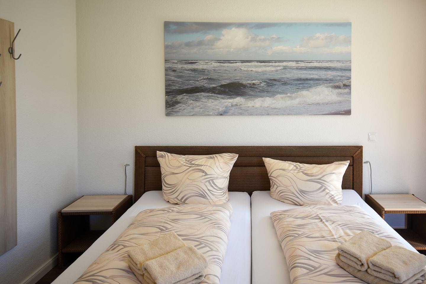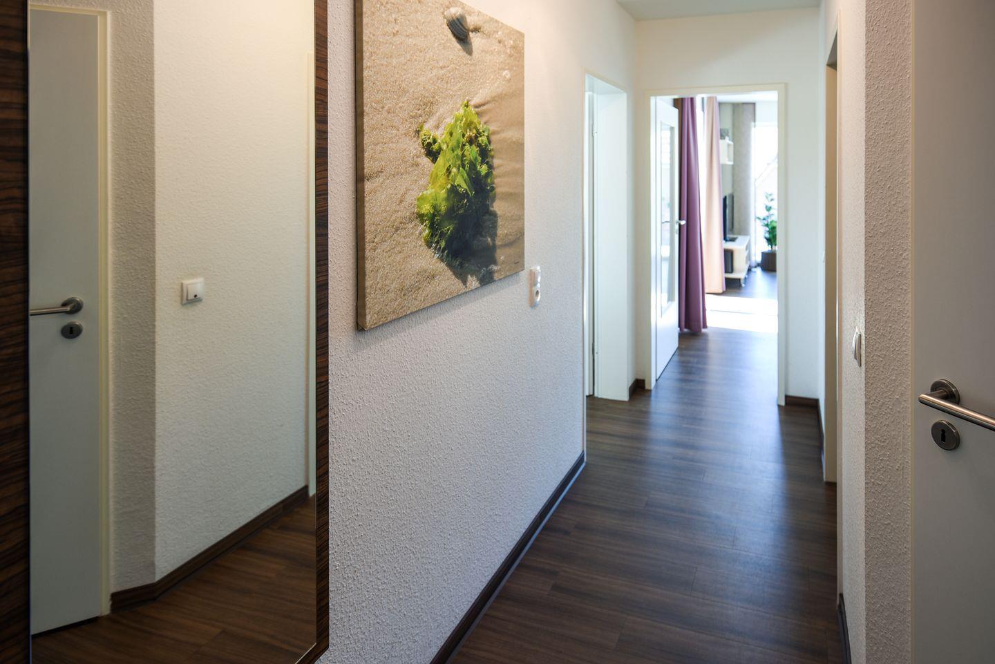 Die Ferienwohnung in Haus 2 in der 1. Etage ist komfortabel ausgestattet mit 2 Schlafzimmern mit Doppelbett und LCD-TV, 1 Badezimmer mit Dusche, WC und eigener Waschmaschine sowie ein separates Gäste-WC. Außerdem verfügt die Ferienwohnung über einen großen Balkon mit südwestlicher Ausrichtung. Ein Stellplatz in der Tiefgarage ist für Sie reserviert. Hier finden Sie auch einen abschließbaren Fahrradraum für die Sicherung Ihrer Räder.