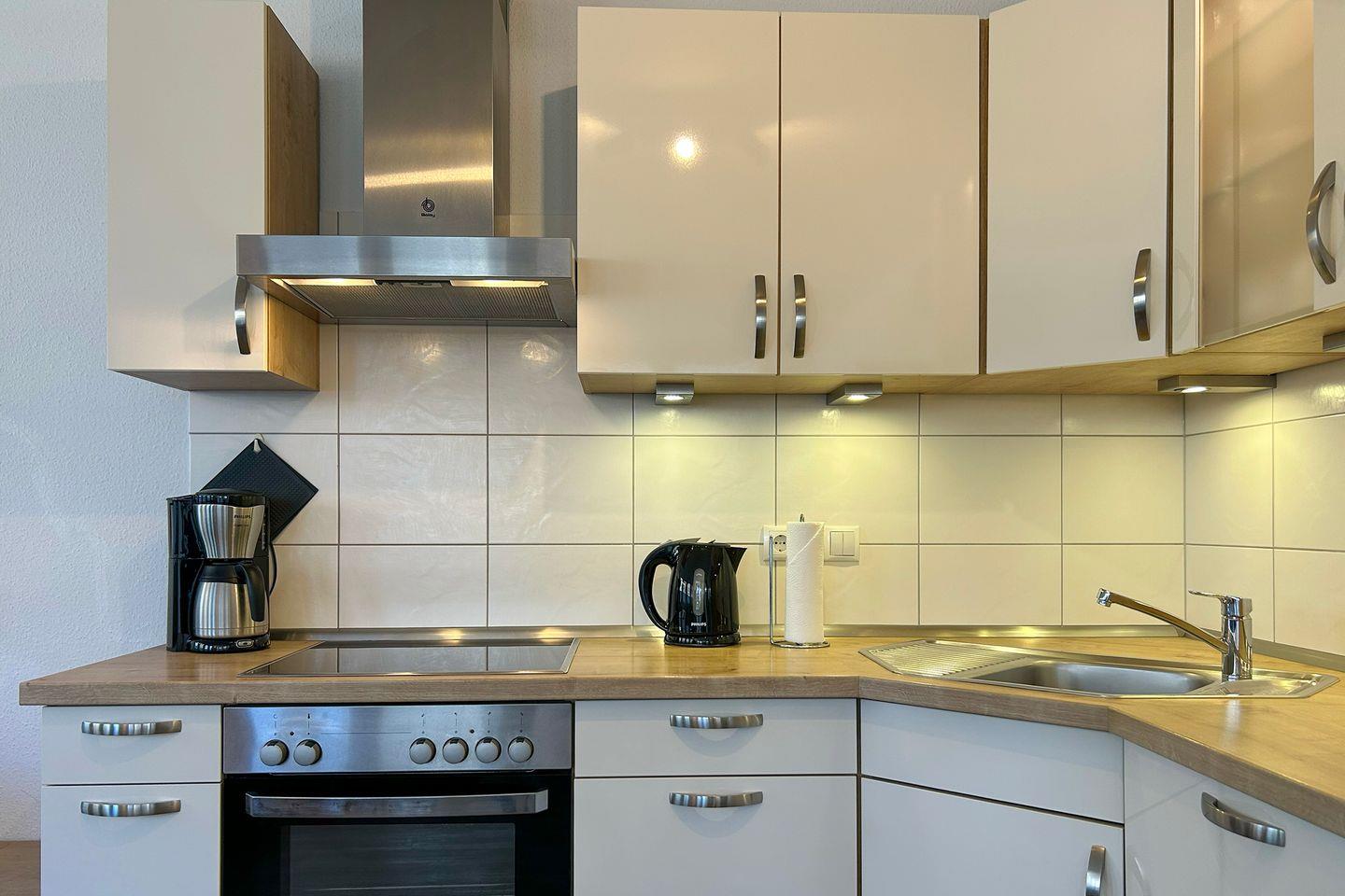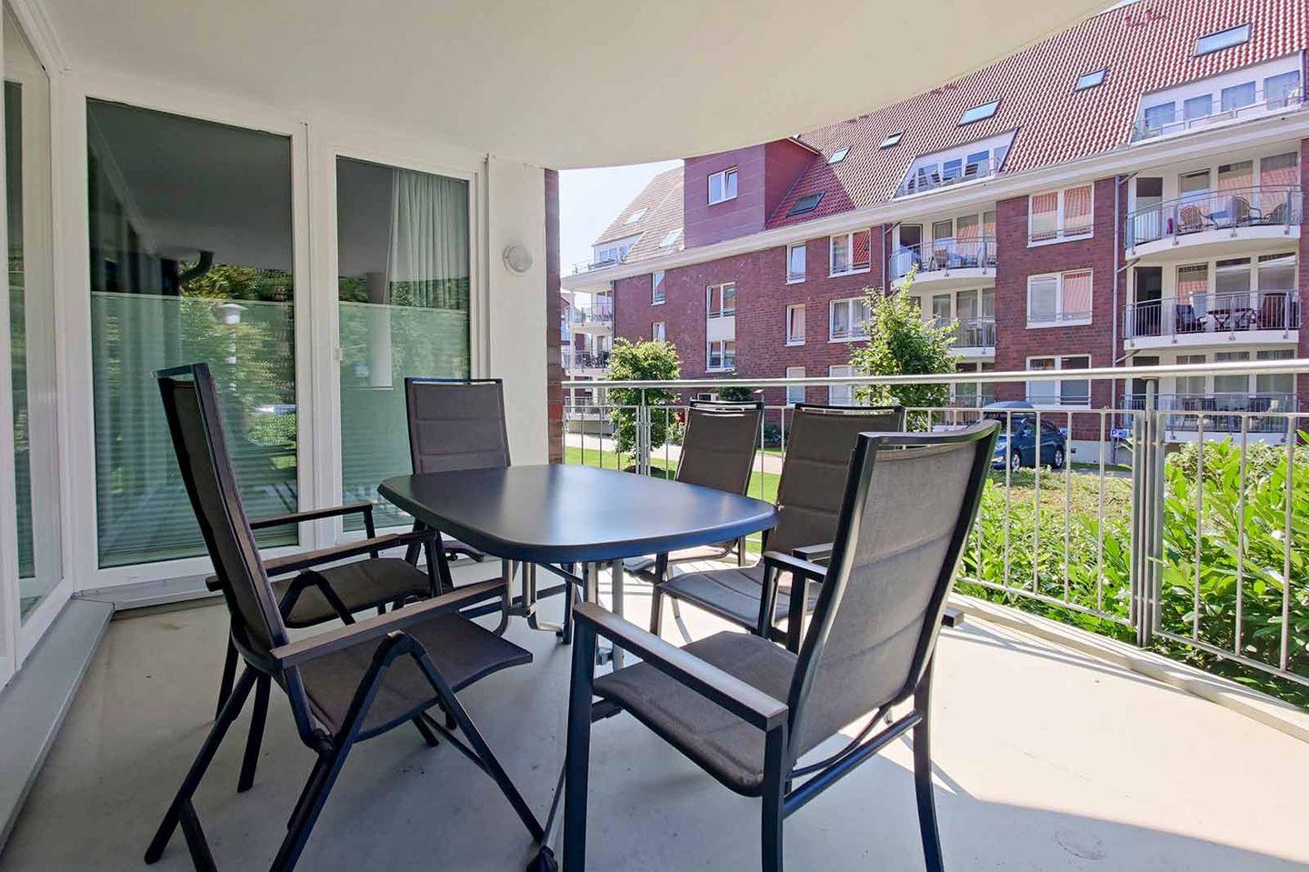 Sie wohnen in Haus 3 der Ferienanlage Hohe Lith in einer großen 3-Zimmer-Ferienwohnung im Hochparterre mit Balkon und Platz für bis zu 6 Personen. Auf dem großzügigen, überdachten Balkon (Nord/West) können Sie die Sonne genießen und entspannen. Die Ferienwohnung verfügt über zwei Schlafzimmer, ein Badezimmer, ein zusätzliches WC, einen Wohn-/Essbereich sowie einen Abstellraum. Die Zimmer sind mit modernen und hochwertigen Möbeln ausgestattet und bieten Ihnen eine gemütliche Umgebung für Ihren Urlaub. Die moderne Küchenzeile ist mit Geschirrspüler, Mikrowelle, Backofen, Cerankochfeld mit Dunstabzugshaube u.m. voll ausgestattet. In der Tiefgarage ist ein Stellplatz für Sie reserviert. Hier finden Sie einen leicht zugänglichen, abschließbaren Fahrradraum.