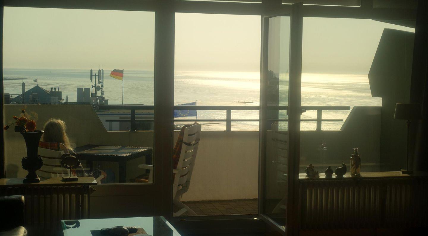 Die Ferienwohnung Nr.108 im 8.OG. 54 qm hat eine super Seesicht zur Insel Neuwerk und von mittags an scheint hier die Sonne bis zum Untergang auf den Balkon.