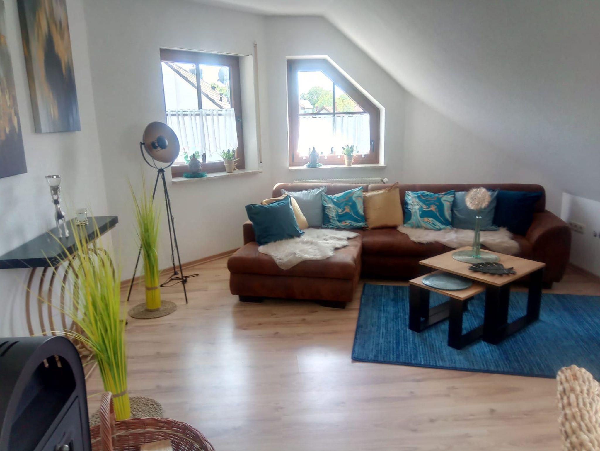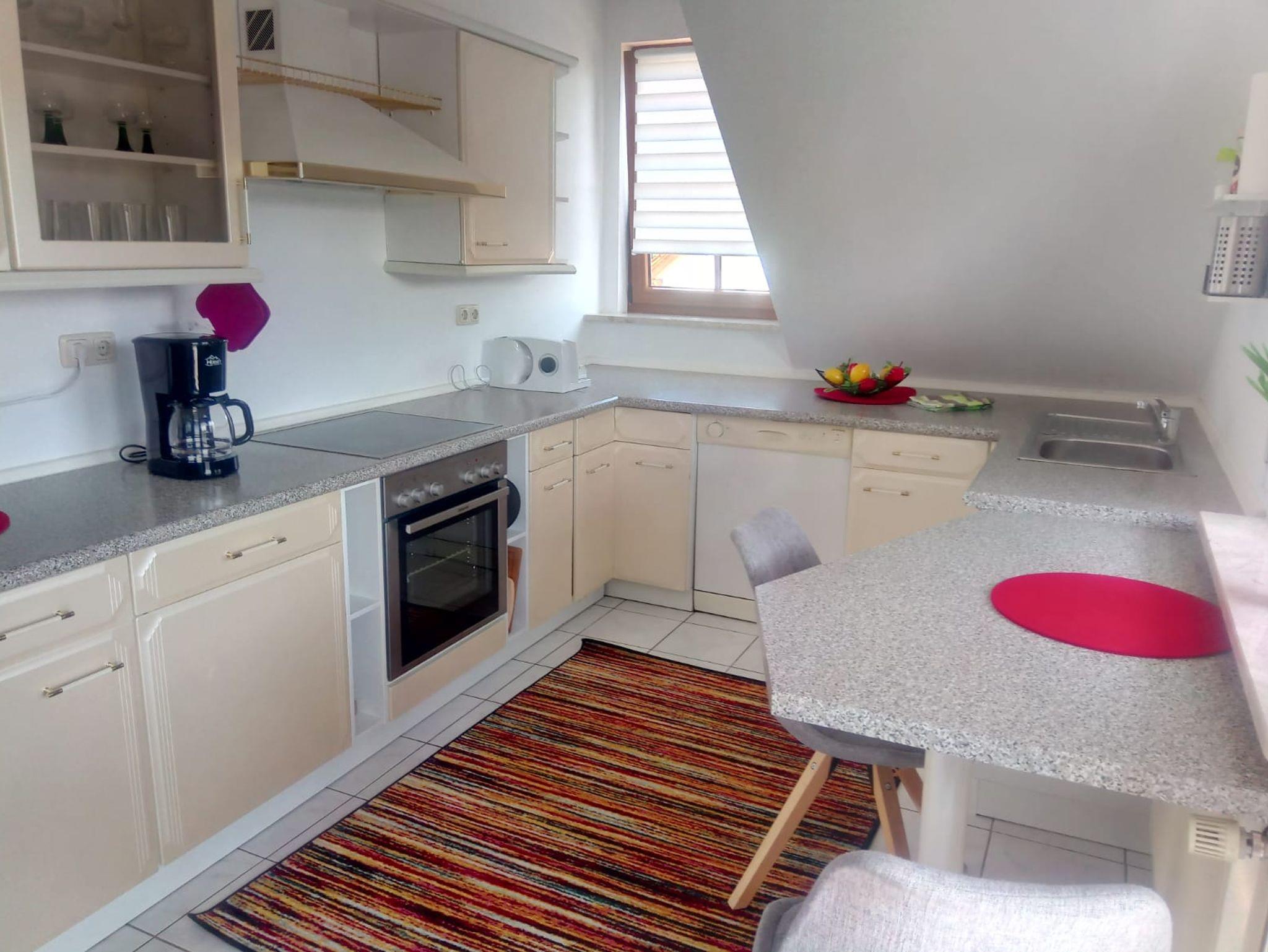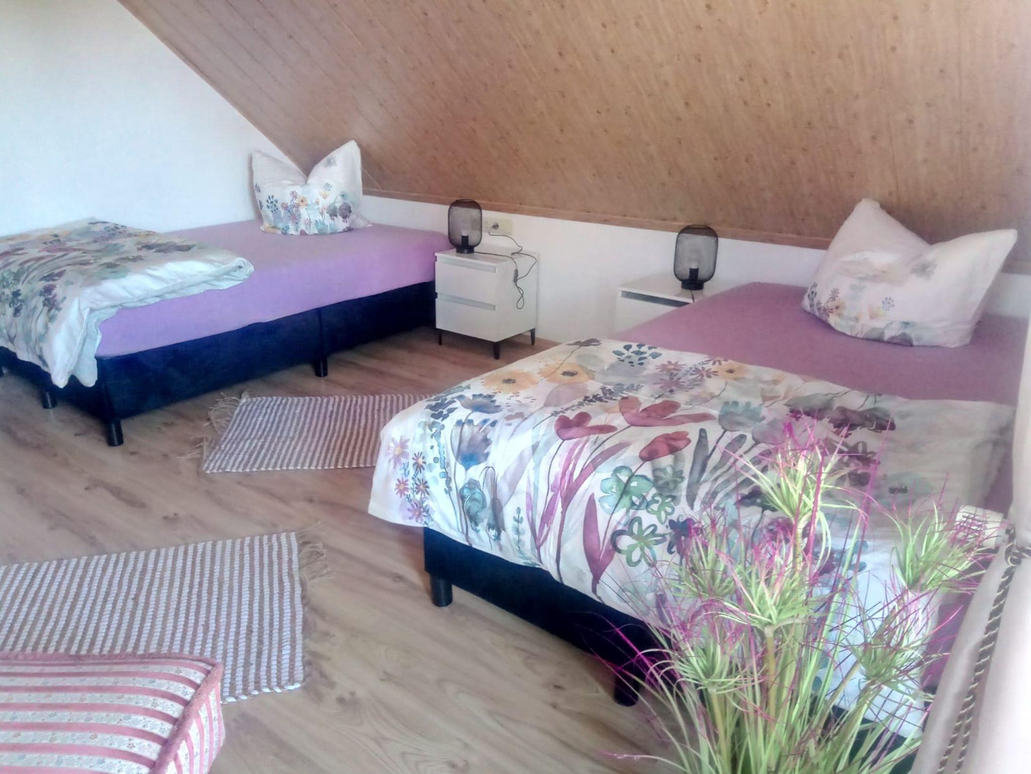 Die Einliegerwohnung im Dachgeschoß bietet auf 73qm Platz für bis zu 4 Personen. Die Wohnung verfügt über 2 Schlafzimmer mit je 2 Einzelbetten. Wohnzimmer mit Essbereich. Küche komplett ausgestattet mit Backofen, Herdplatten, Kühl und Gefrierkombination sowie einer Spülmaschine. Das Badezimmer verfügt über eine Dusche, WC und Waschbecken. 2 Balkons mit Vesteblick.