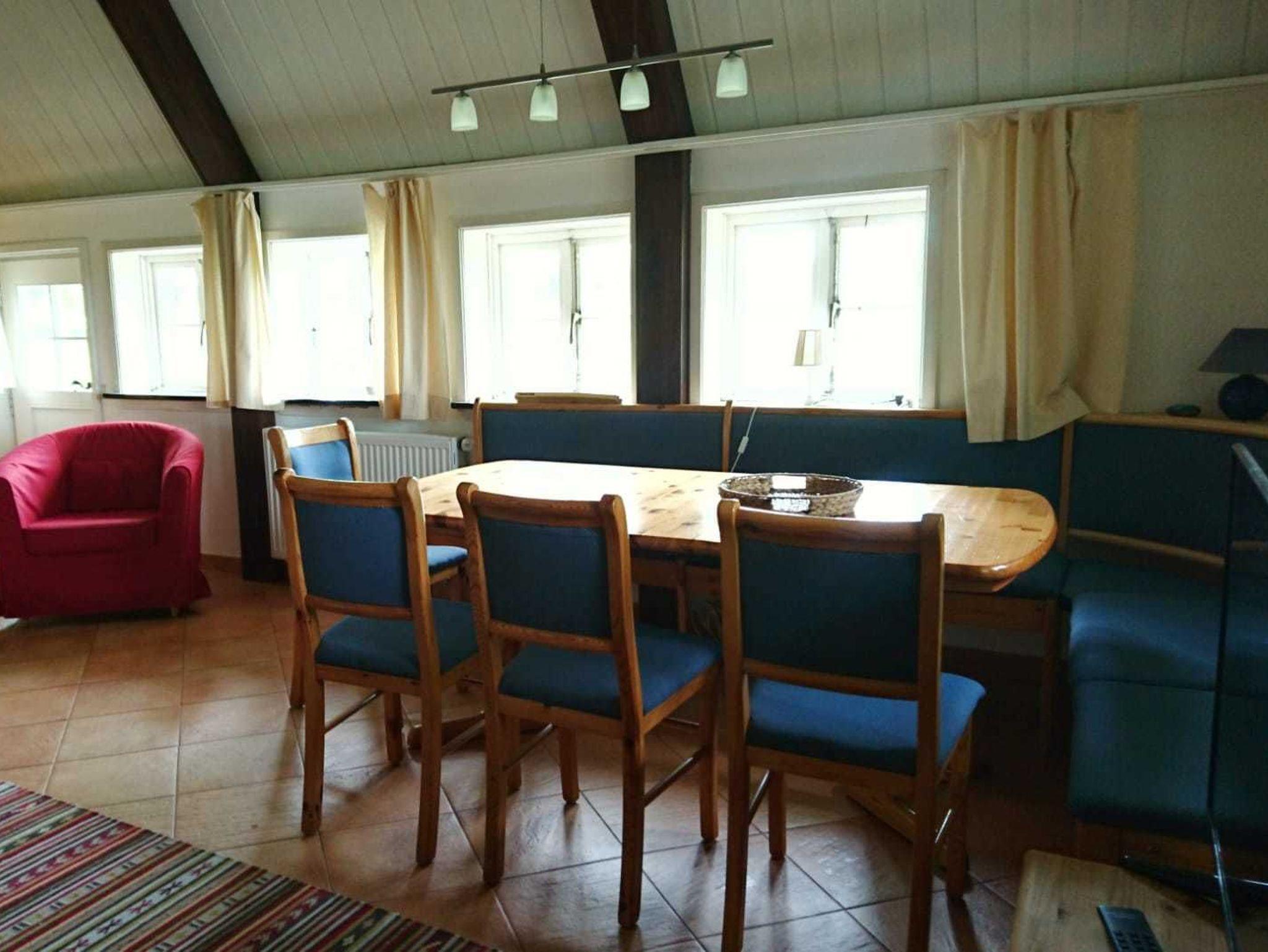 Das Haus ist aufgeteilt in eine große Wohnhalle mit Essecke und Kamin. Vom großen Esstisch aus blicken Sie auf weite Felder, über die das eine oder andere Reh zieht.