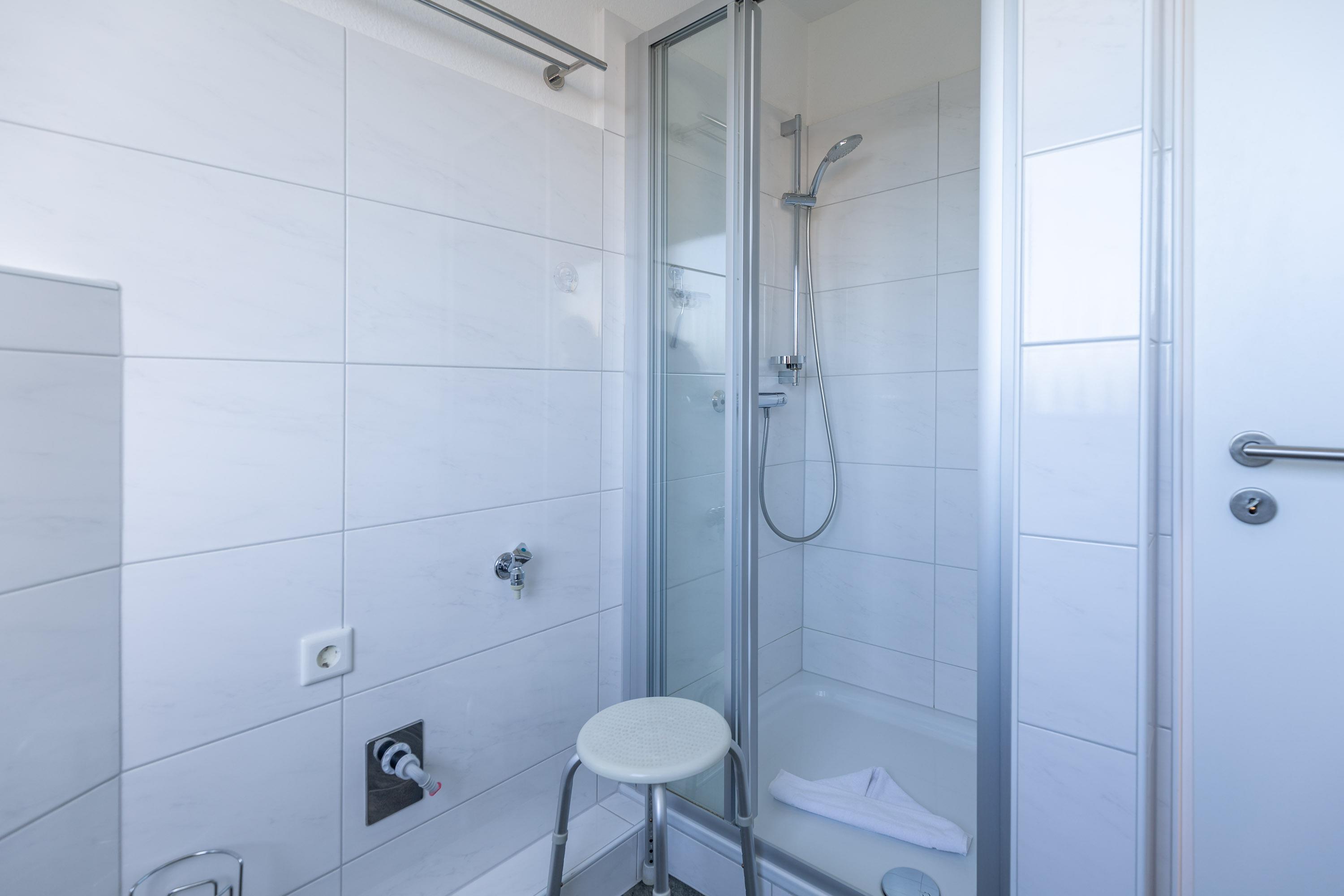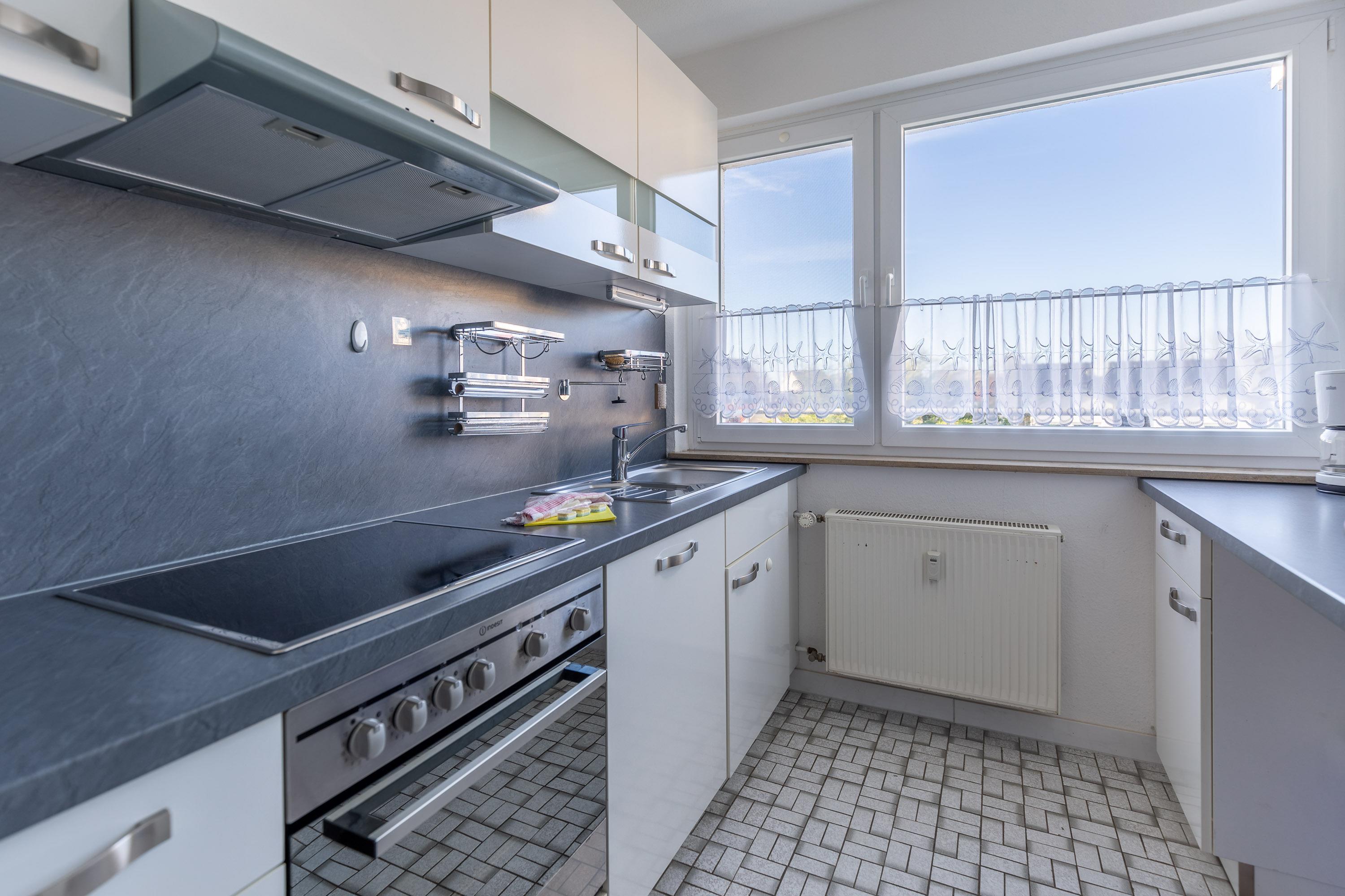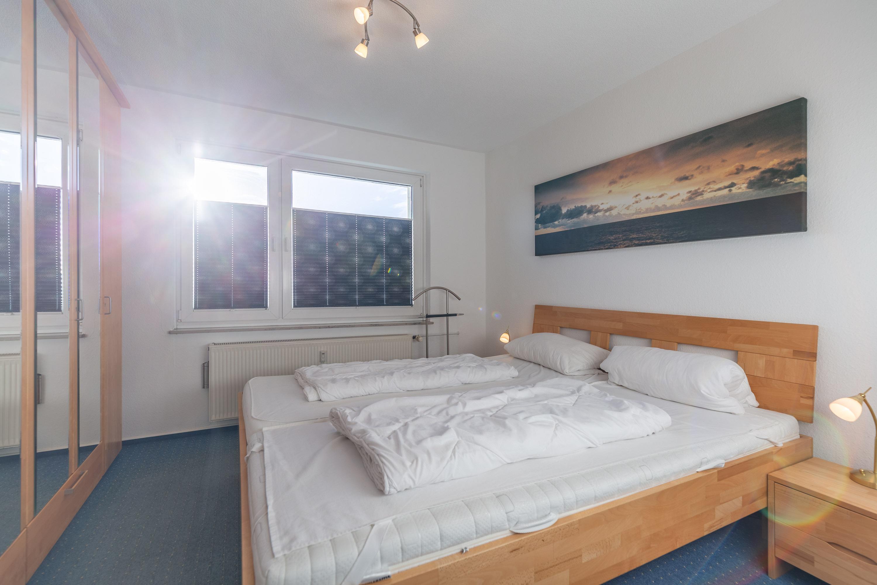 Die separate Küche ist mit einem Backofen, einem Ceranfeld mit 4-Kochstellen, einem Geschirrspüler, einer Mikrowelle, einer Kaffeemaschine, sowie einem Kühlschrank mit Gefrierfach ausgestattet. Das erste Schlafzimmer verfügt über ein komfortables Doppelbett in Überlänge und Komforthöhe (2x90x220). Das zweite Schlafzimmer ist mit einem Etagenbett (2x90x200) ausgestattet. Die separaten Schlafzimmer gewährleisten einen erholsamen Schlaf. Neben einem modernen Bad mit WC und Dusche verfügt Ferienwohnung Grimmershörn 31 über ein zusätzliches Gäste-WC.