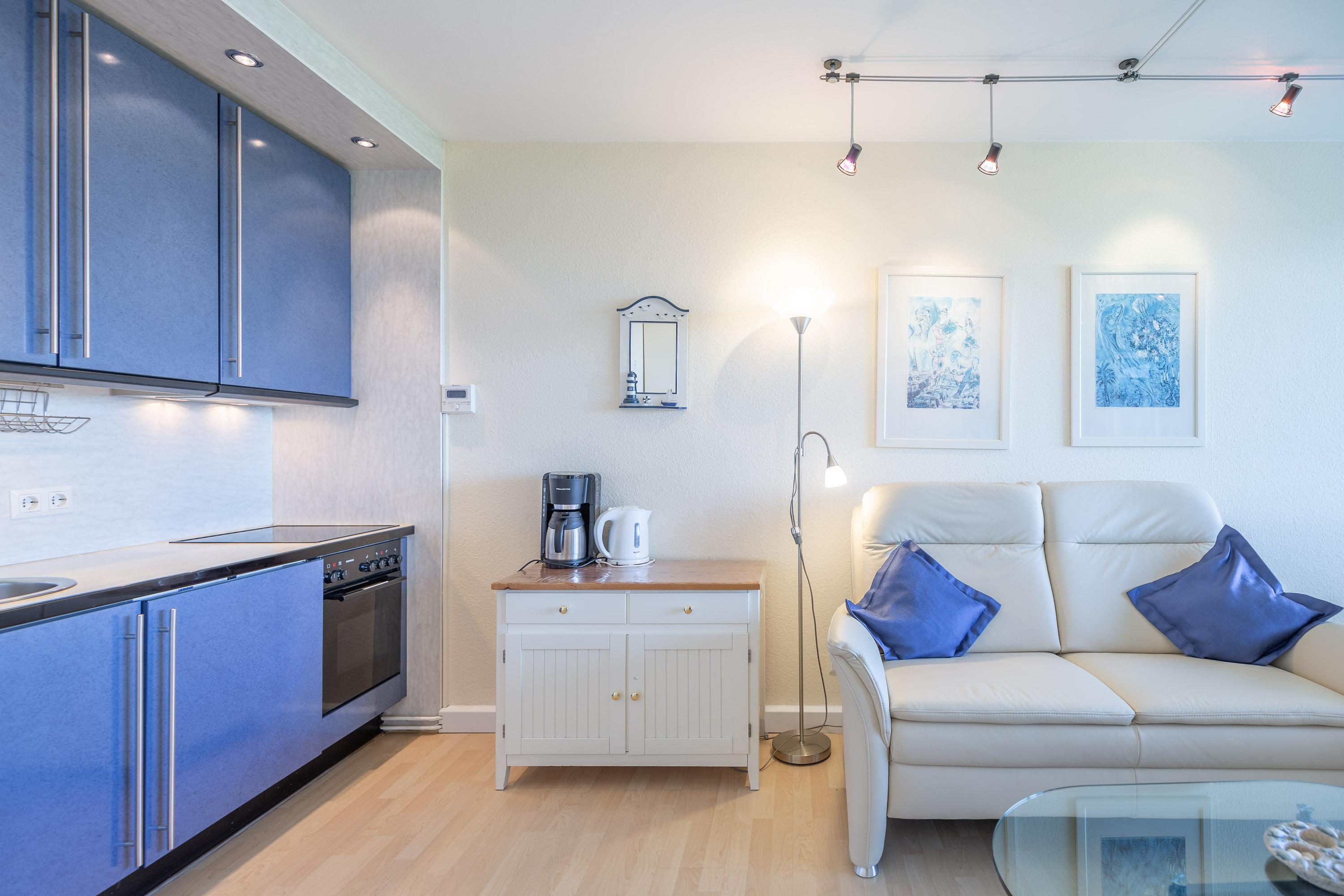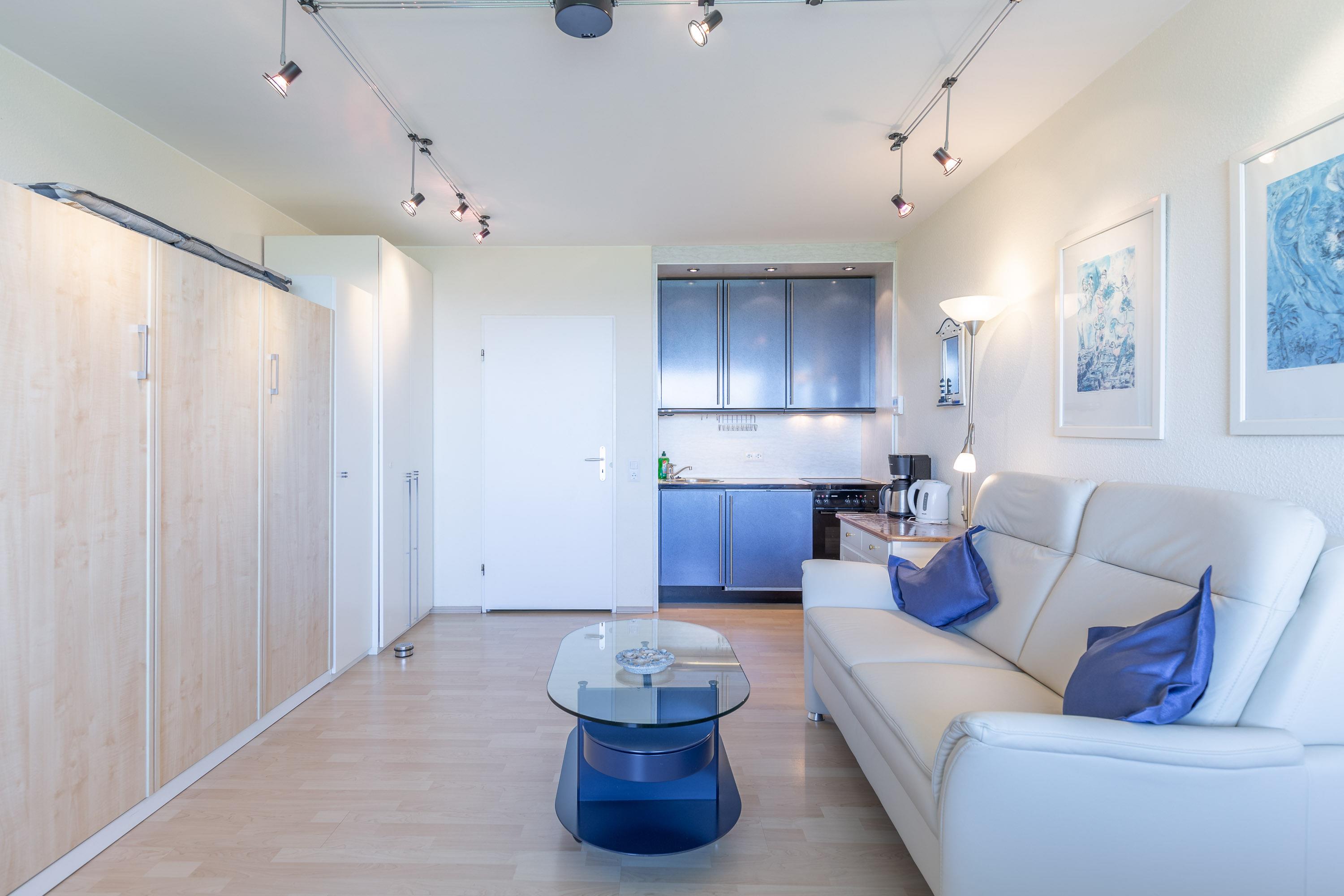 Der kombinierte Wohn- und Schlafbereich ist vollständig möbliert. Die integrierte Küchenzeile ist mit einem Ceranfeld (4 Kochstellen), einer Kaffeemaschine sowie den üblichen Küchenutensilien ausgestattet. Das komfortable Schrankbett mit einer Liegefläche von 160 cm ist mit zwei getrennten Taschenfederkernmatratzen ausgestattet. Das Bad mit Dusche und WC verfügt über ein Fenster zum Belüften. Auch vom Balkon genießen Sie den traumhaften Meerblick. Ein KFZ-Stellplatz ist vorhanden, sowie kostenloses WLAN.