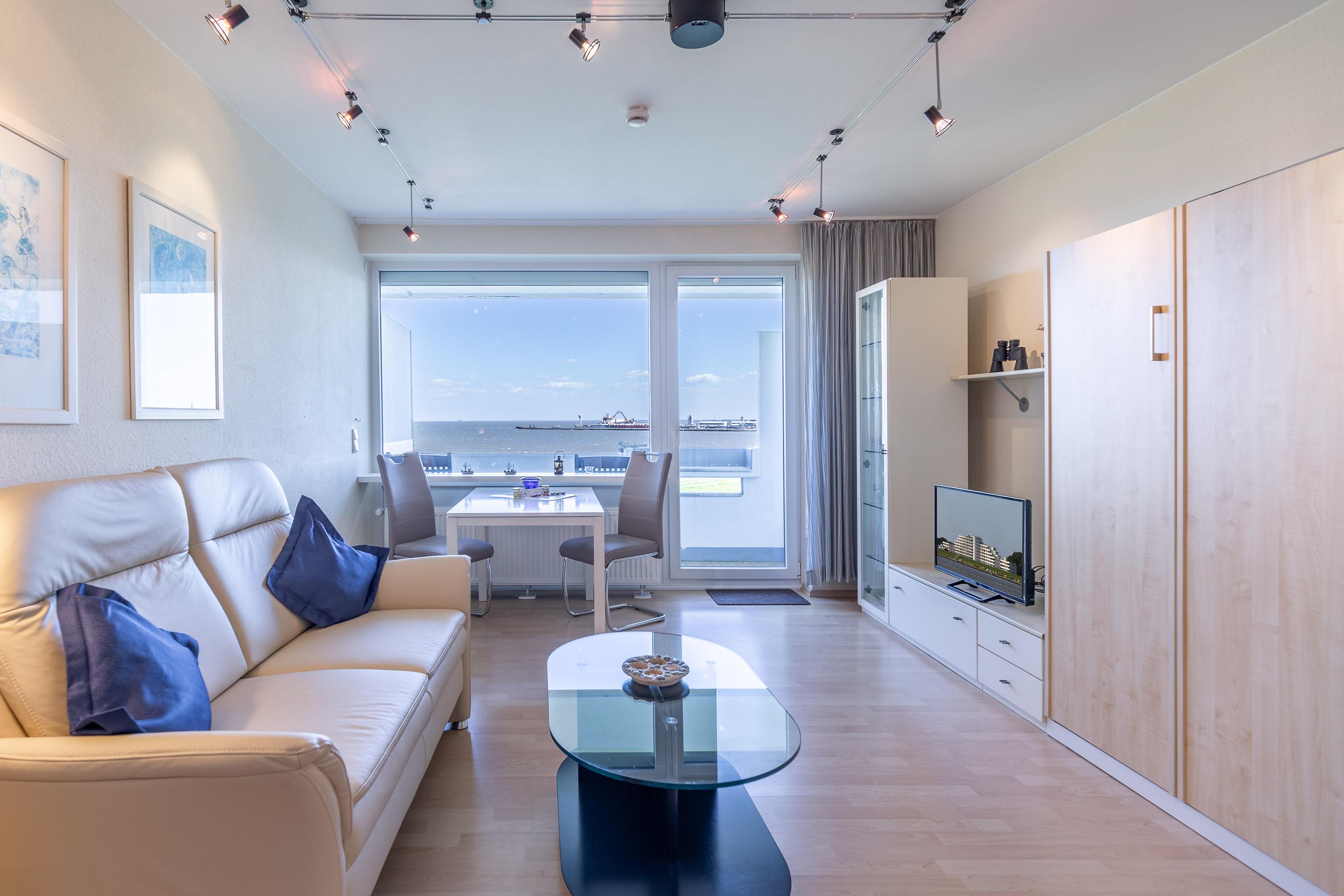 Was für eine Kulisse! Aus der 5. Etage haben Sie jederzeit das muntere Treiben auf dem Weltschifffahrtsweg im Blick - ein echtes Erlebnis. Genießen Sie den Ausblick auf vorbeifahrende Kutter, Kreuzfahrer und Großsegler, die sich wie eine Perlenschnur aneinander reihen.