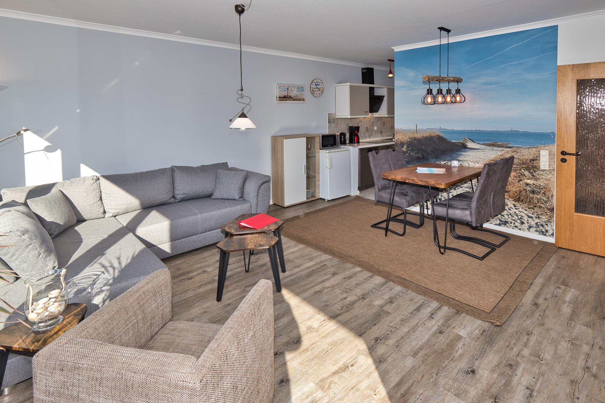 Der Wohnbereich ist mit einer gemütlichen Couchgarnitur, TV, Radio und kostenlosem WLAN ausgestattet. Ein separater Essplatz für 4 Personen sowie die gut ausgestattete Küche mit Spülmaschine, Backofen, Kaffeemaschine und Toaster runden das Angebot ab.