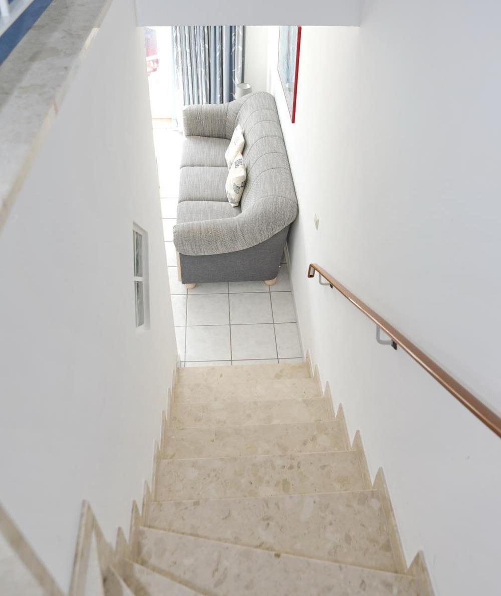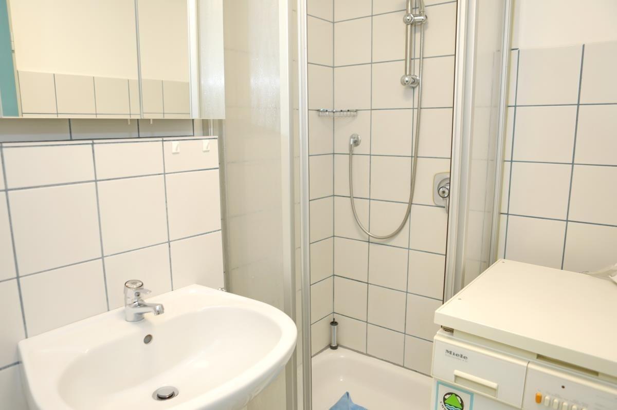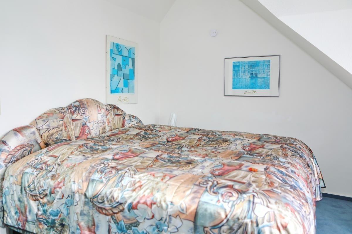 Im Obergeschoss liegen die beiden Schlafzimmer: eines mit Doppelbett, Kleiderschrank, Kommode und Sitzgruppe mit Hafenblick, das zweite mit Einzelbett, Kleiderschrank und Sitzmöglichkeiten. Dazwischen befindet sich das Badezimmer mit Dusche, WC und Handwaschbecken. Eine Waschmaschine steht zur Verfügung.