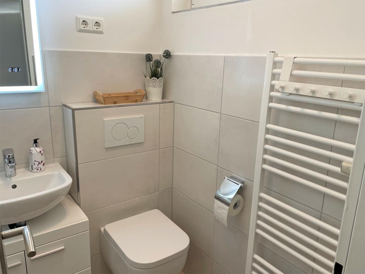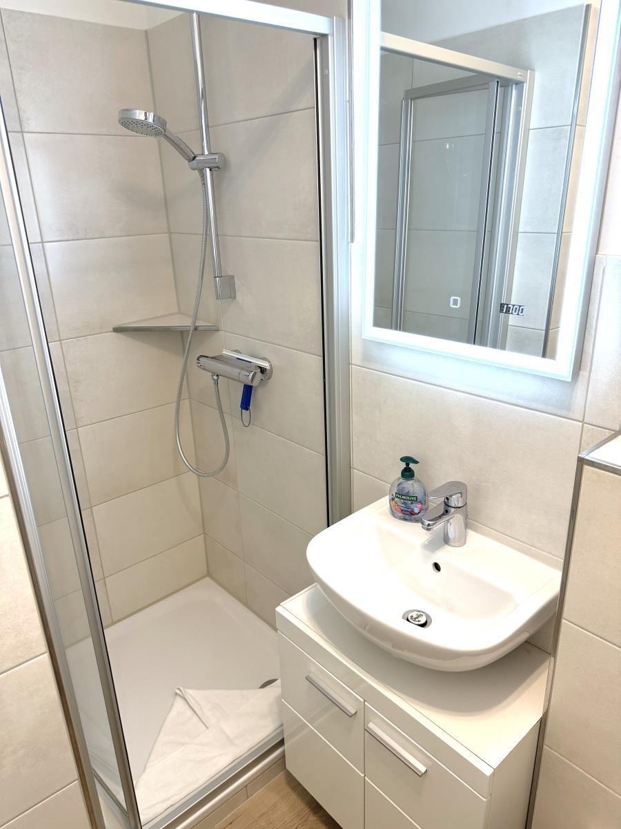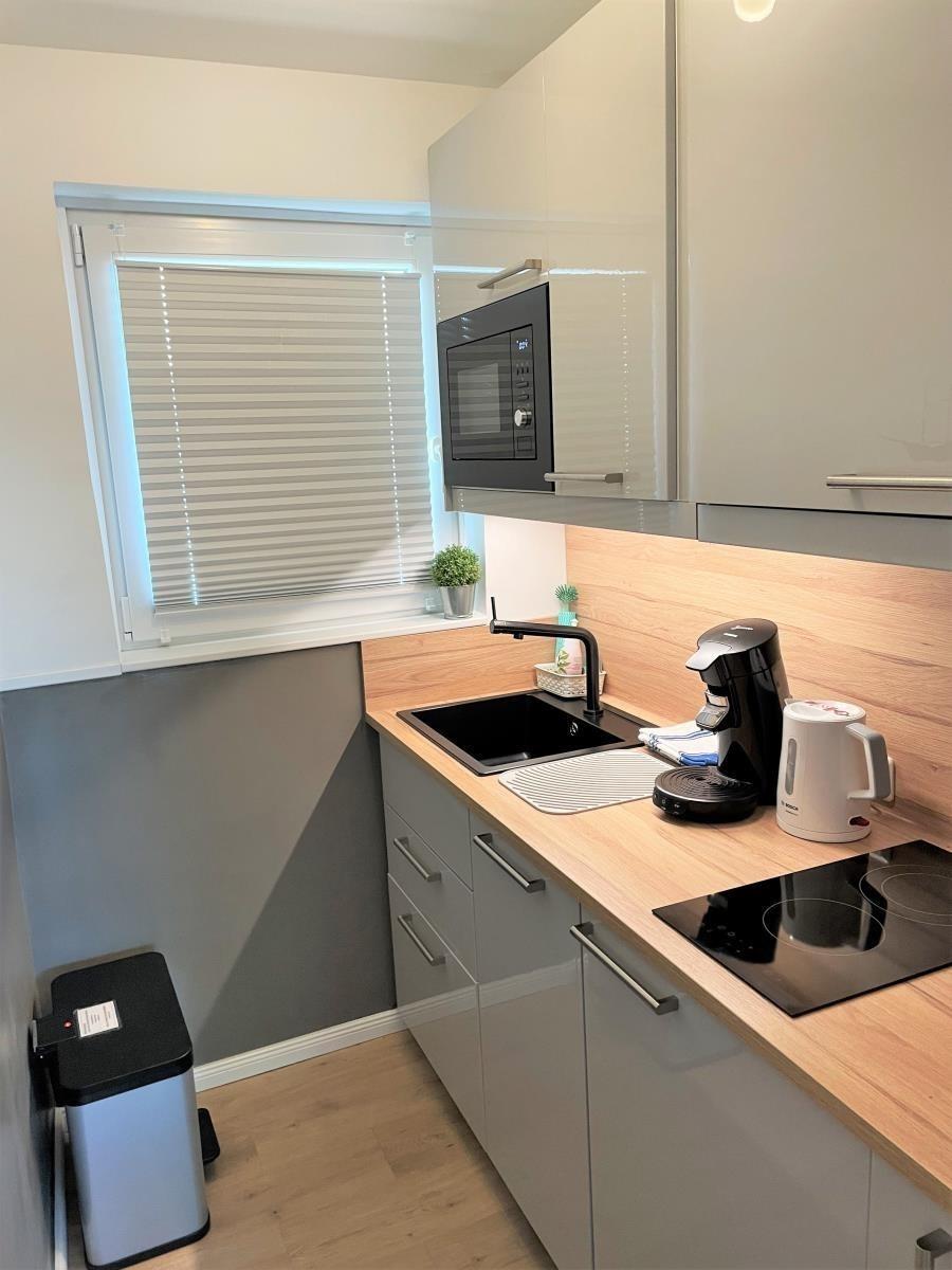 Die moderne Küche ist bestens ausgestattet mit 2-Platten-Cerankochfeld, Kaffeepad-Maschine, Wasserkocher, Mikrowelle, Geschirrspüler sowie Kühlschrank mit Eisfach.Das frisch modernisierte Duschbad verfügt über WC, Handtuchheizung und Föhn.