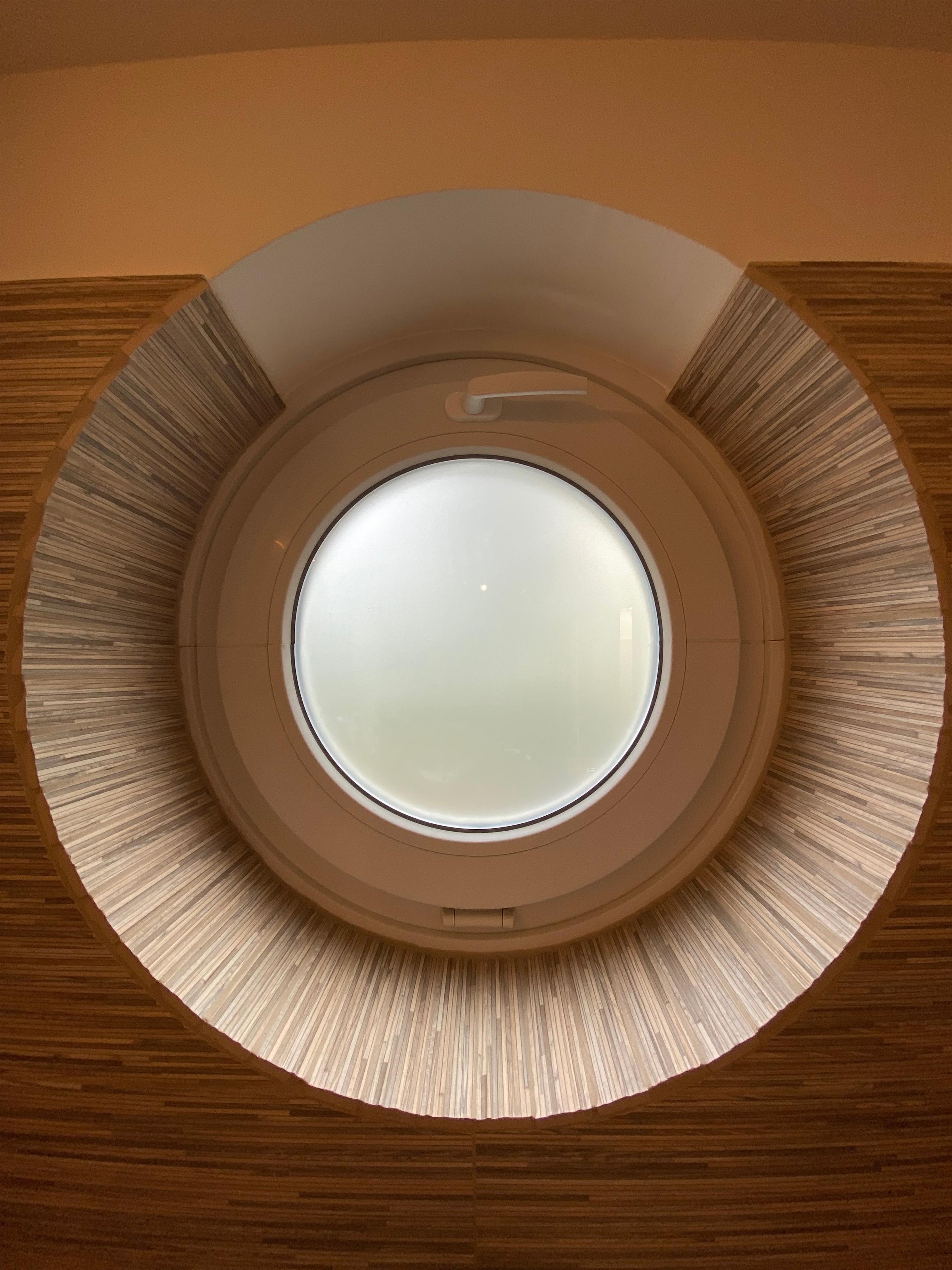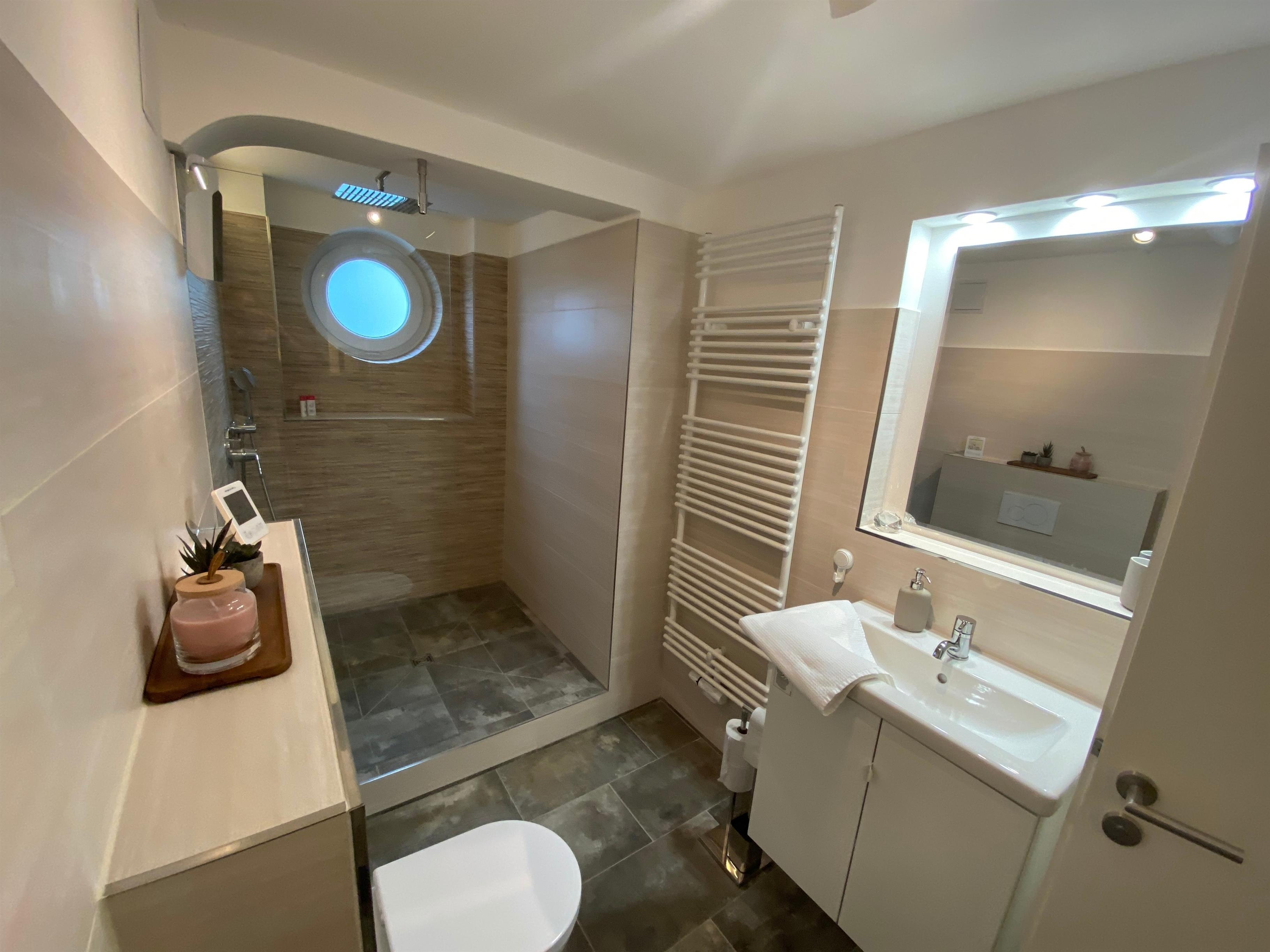 • Geräumiges Badezimmer mit Rundfenster und Dusche