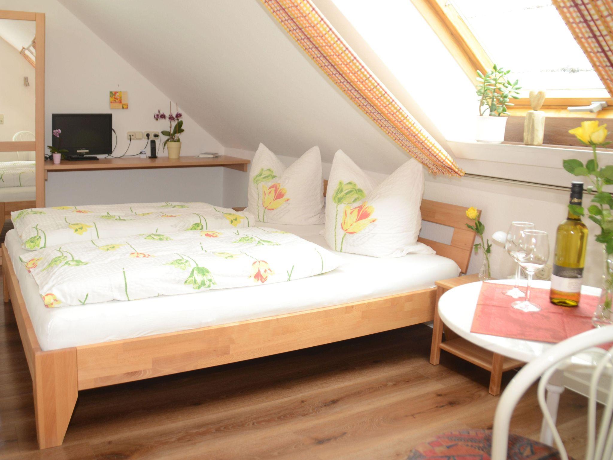 Ihnen stehen vier Doppelzimmer, die auch als Einzelzimmer belegt werden, zur Verfügung. Durch ein Beistellbett ist auch eine Übernachtung im Dreibettzimmer möglich. Drei unserer Doppelzimmer befinden sich im 2. Obergeschoss mit einer Dachschräge, davon sind zwei mit einem innen liegenden Bad mit Dusche und WC und eins mit einem Tageslichtbad mit Wanne und WC ausgestattet. Unser Gästezimmer im Erdgeschoss mit einer kleinen Küchenzeile verfügt über ein innen liegendes Bad mit Dusche und WC. Alle Zimmer (Nichtraucher-Zimmer) haben einen Fernseher (Flachbildschirm) und verfügen über einen kostenlosen WLAN-Zugang. Dusch- und Handtücher, sowie ein Fön sind in den Bädern vorhanden. Wir bitten um Verständnis, dass aus Rücksicht auf die anderen und nachfolgenden Gäste keine Haustiere bei uns aufgenommen werden können.
