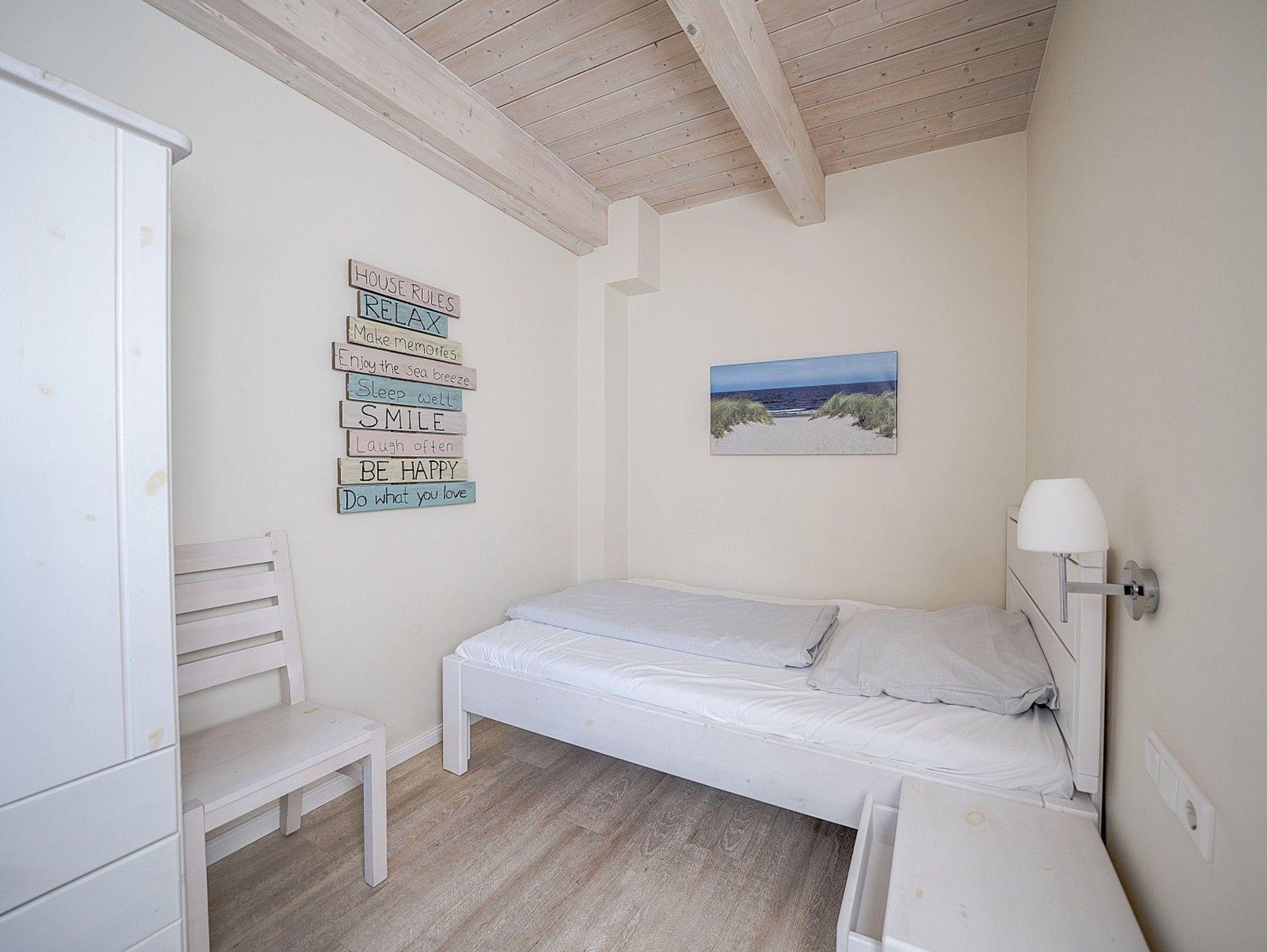 Im Obergeschoss sorgen eine private Sauna und eine große Badewanne für zwei Personen für wohltuende Entspannung. Zwei weitere Schlafzimmer bieten Rückzugsorte mit viel Komfort und Ruhe. Auf der Terrasse mit Strandkorb, Grill und Gartenmöbeln oder auf dem Balkon lässt sich die frische Nordseeluft in vollen Zügen genießen. Der eingezäunte Garten bietet Sicherheit und Raum zum Spielen.