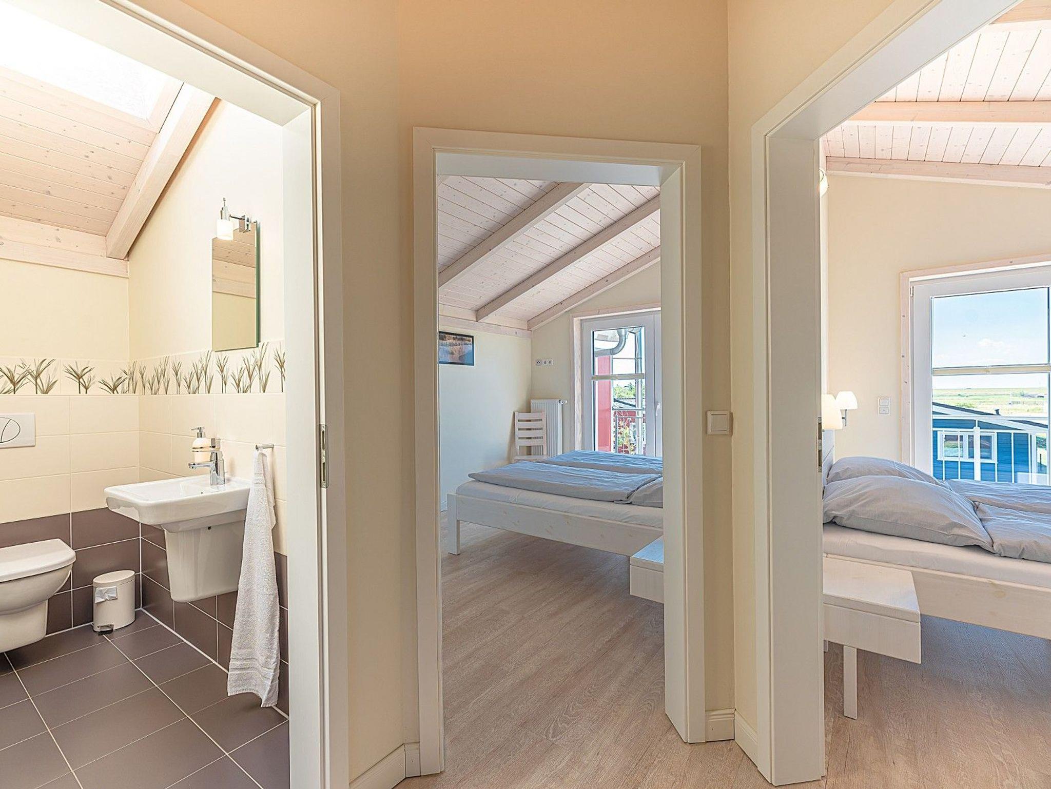 Im Obergeschoss erwarten Sie zwei weitere Schlafzimmer und ein großzügiges Wellnessbad mit Sauna und XXL-Badewanne für zwei Personen. Vom Balkon lässt sich die frische Nordseeluft genießen, während die teilweise überdachte Terrasse mit Grill zu entspannten Stunden im Freien einlädt.