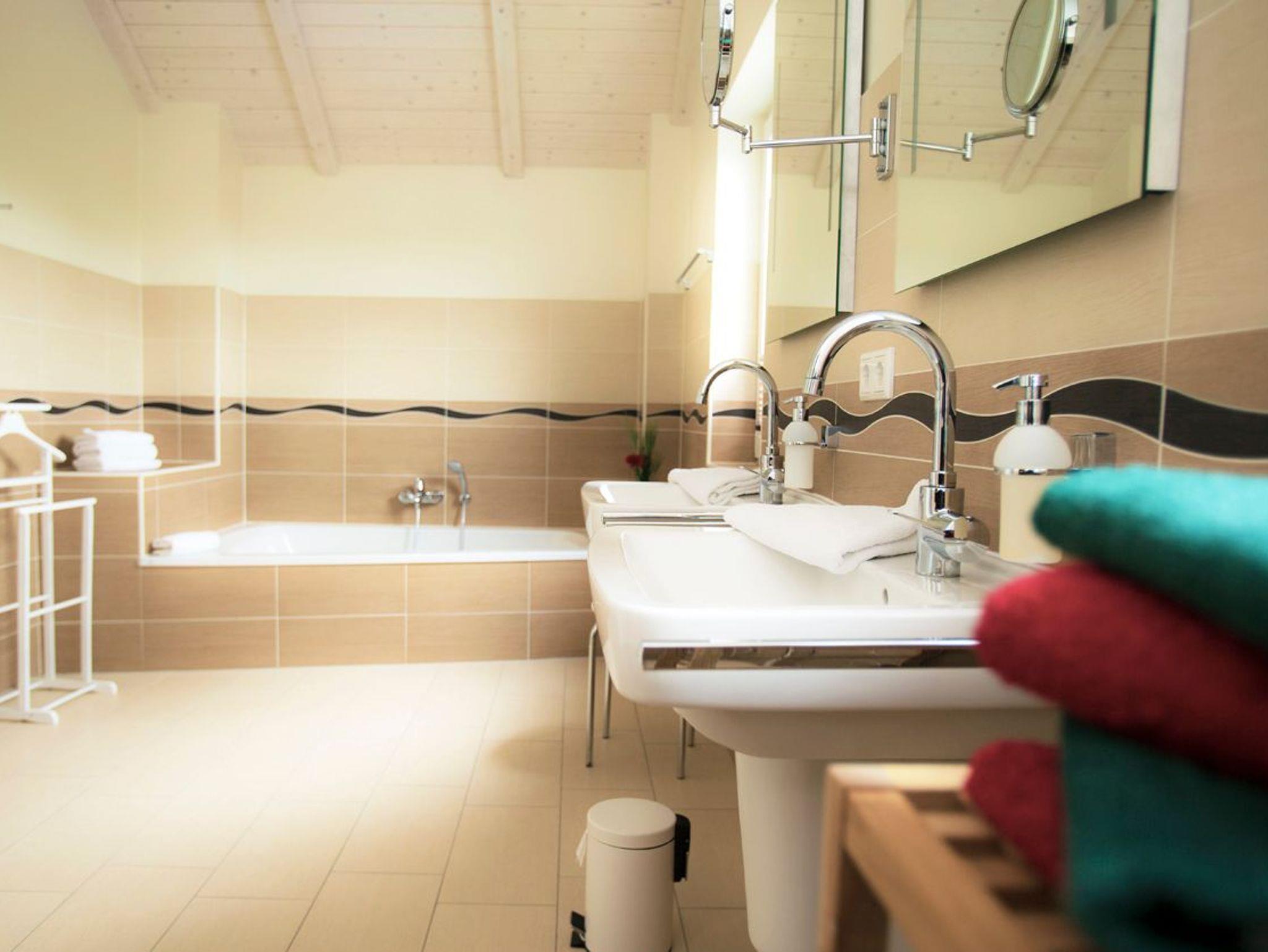 Im Obergeschoss erwartet Sie ein großzügiges Wellnessbad mit XXL-Badewanne, Dusche und Sauna. Zwei Schlafzimmer mit Doppelbetten und Zugang zum Balkon bieten Rückzugsorte mit Ausblick.