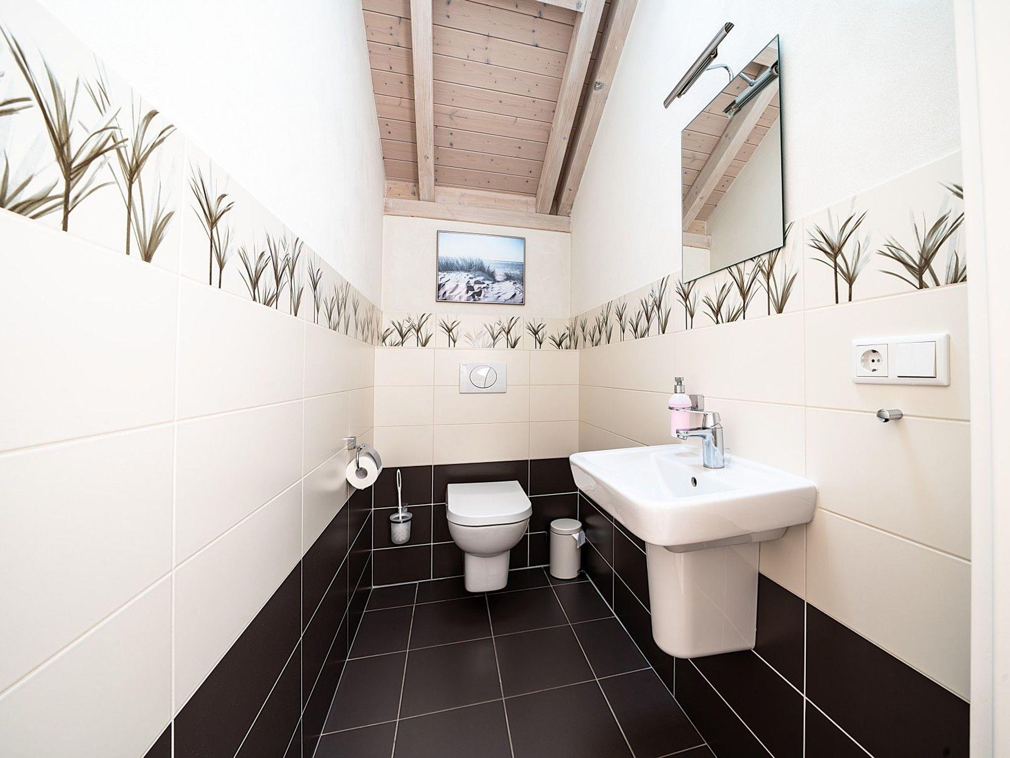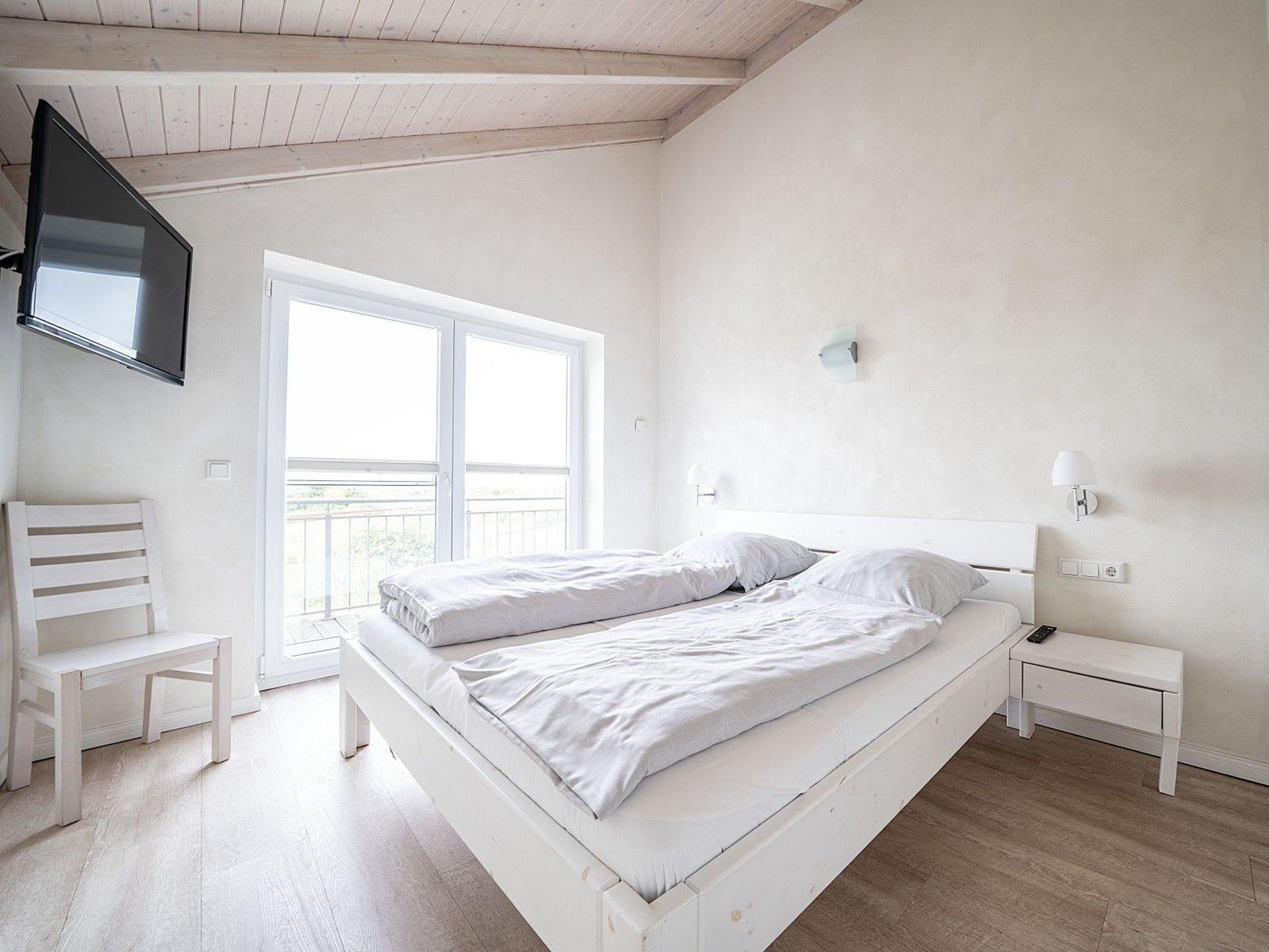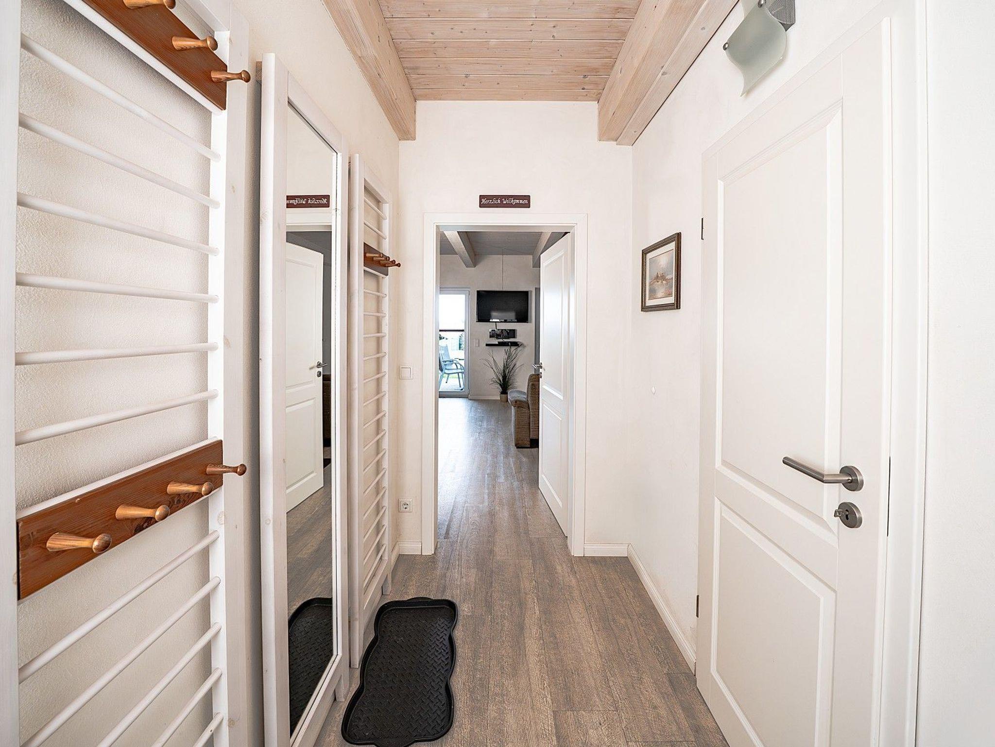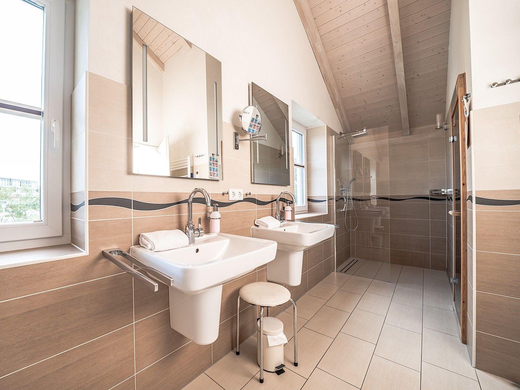 Im Erdgeschoss sorgt ein barrierearmes Bad mit ebenerdiger Dusche für zusätzlichen Komfort. Dort liegt auch ein Einzelzimmer mit 1,20 m breitem Bett, das sich besonders für Gäste eignet, die Treppen vermeiden möchten. Zwei weitere Schlafzimmer mit Doppelbetten befinden sich im Obergeschoss. In der Hauptsaison sind fast alle Fenster mit Fliegengittern ausgestattet.