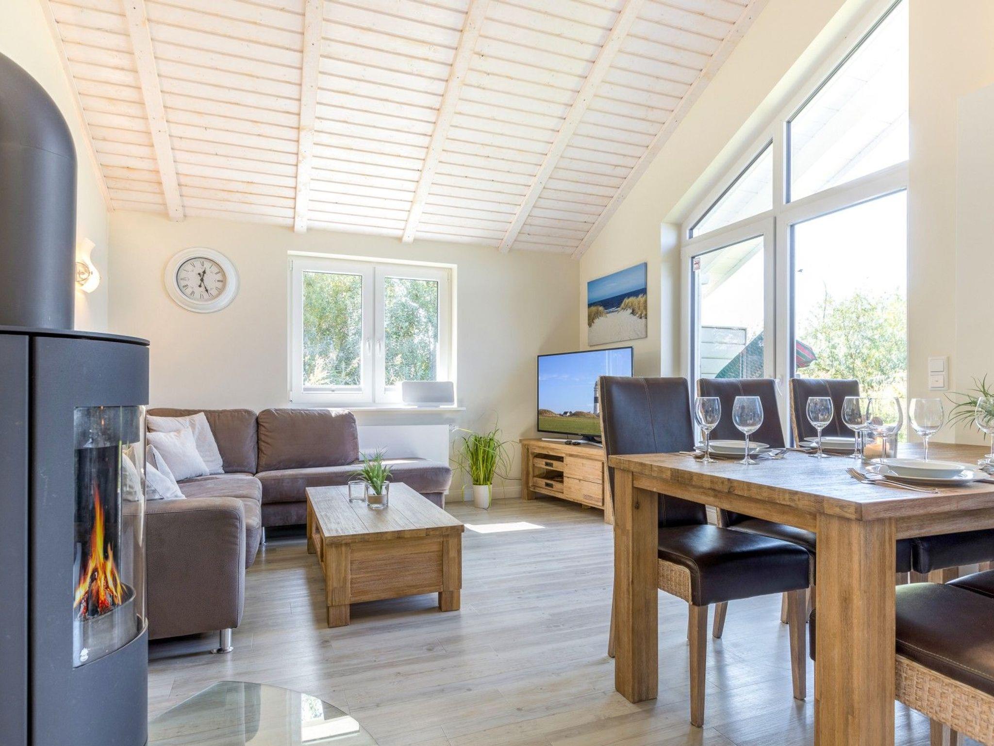 Innen überzeugt das Haus mit einer stilvollen Einrichtung, großzügigen Räumen und einer offenen, voll ausgestatteten Küche. Zwei Schlafzimmer mit Doppelbetten und ein modernes Bad mit Dusche und Badewanne bieten hohen Komfort. Nach einem Tag am Meer sorgen Sauna und Kaminofen für wohlige Wärme und Entspannung.