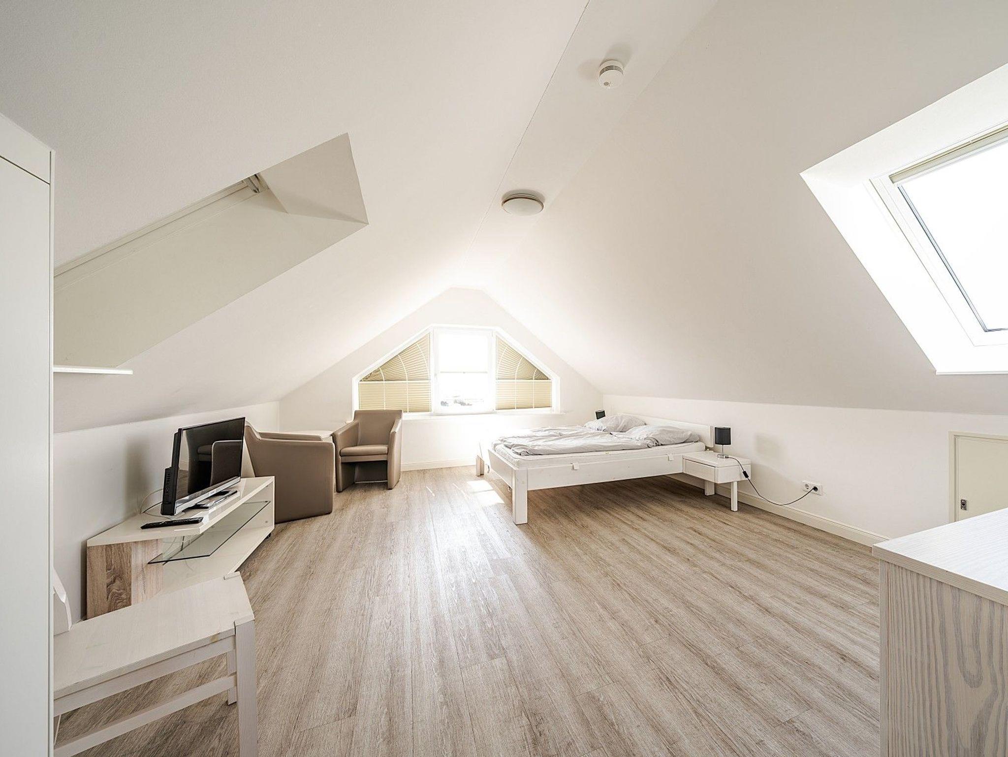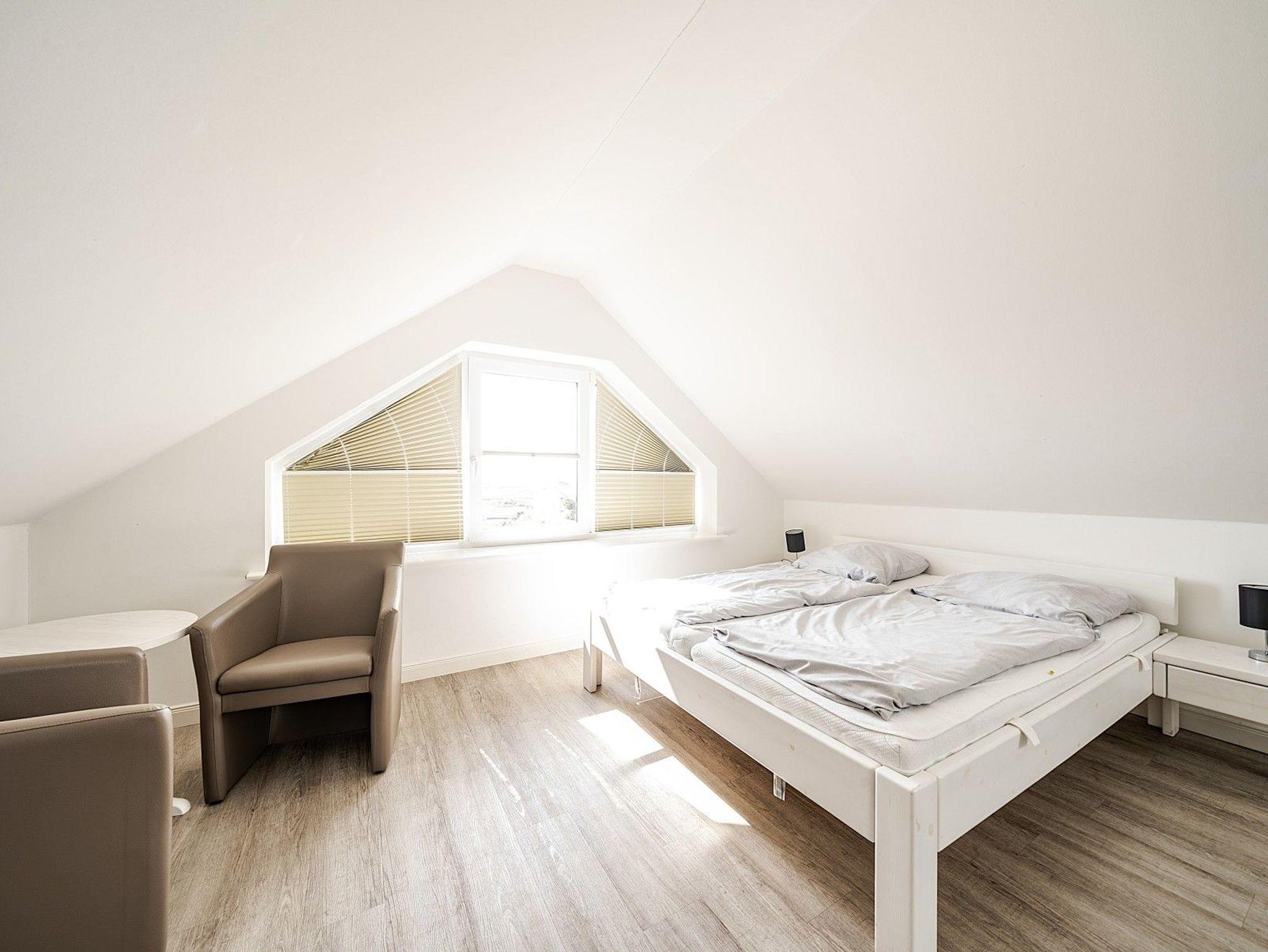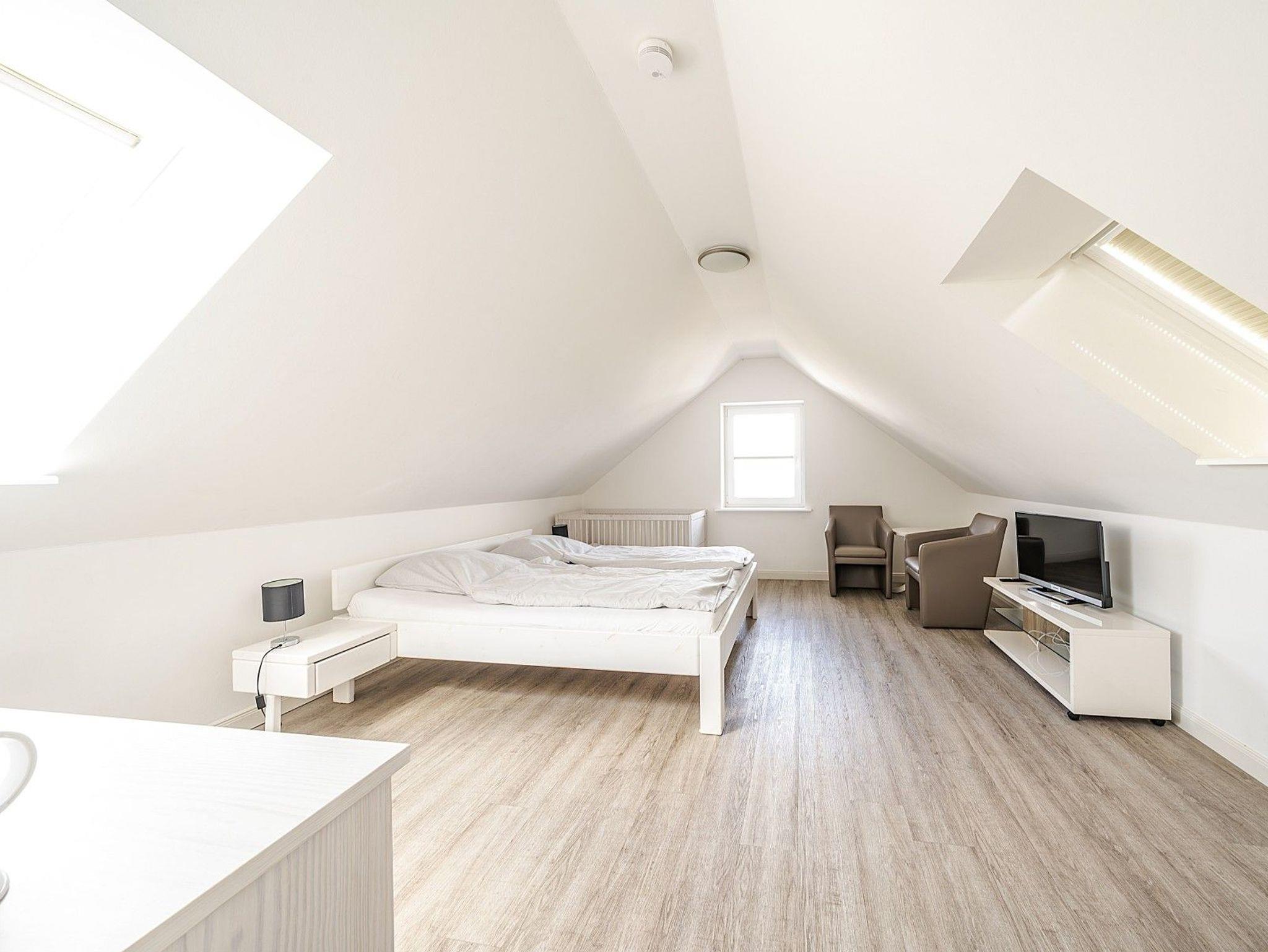 Die 6 Schlafzimmer verteilen sich auf zwei Etagen. Im Dachgeschoss befinden sich drei großzügige Doppelzimmer, jeweils mit eigenem Bad und kleiner Teeküche. Im 1. Obergeschoss liegen drei weitere Schlafzimmer, die sich ein großes Bad mit XXL-Dusche und Badewanne sowie ein separates WC teilen. Die Wohnung verfügt über kostenloses WLAN und mehrere TV-Geräte. Zwei kostenfreie Parkplätze befinden sich in der Nähe, weitere Stellplätze sind auf einem Großparkplatz (ca. 500m) verfügbar.