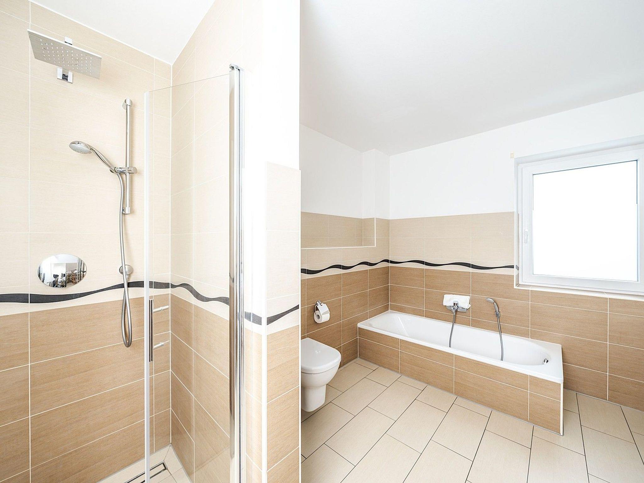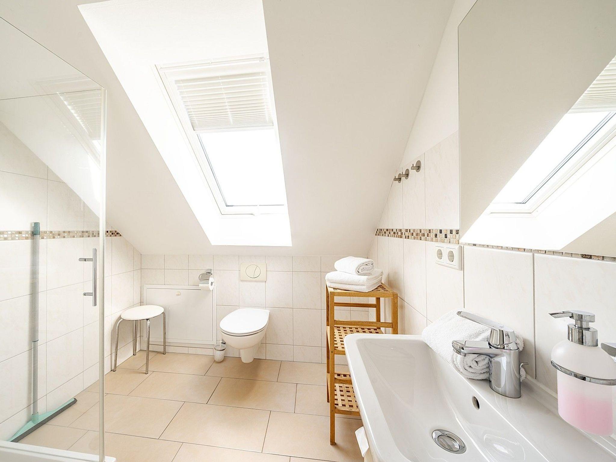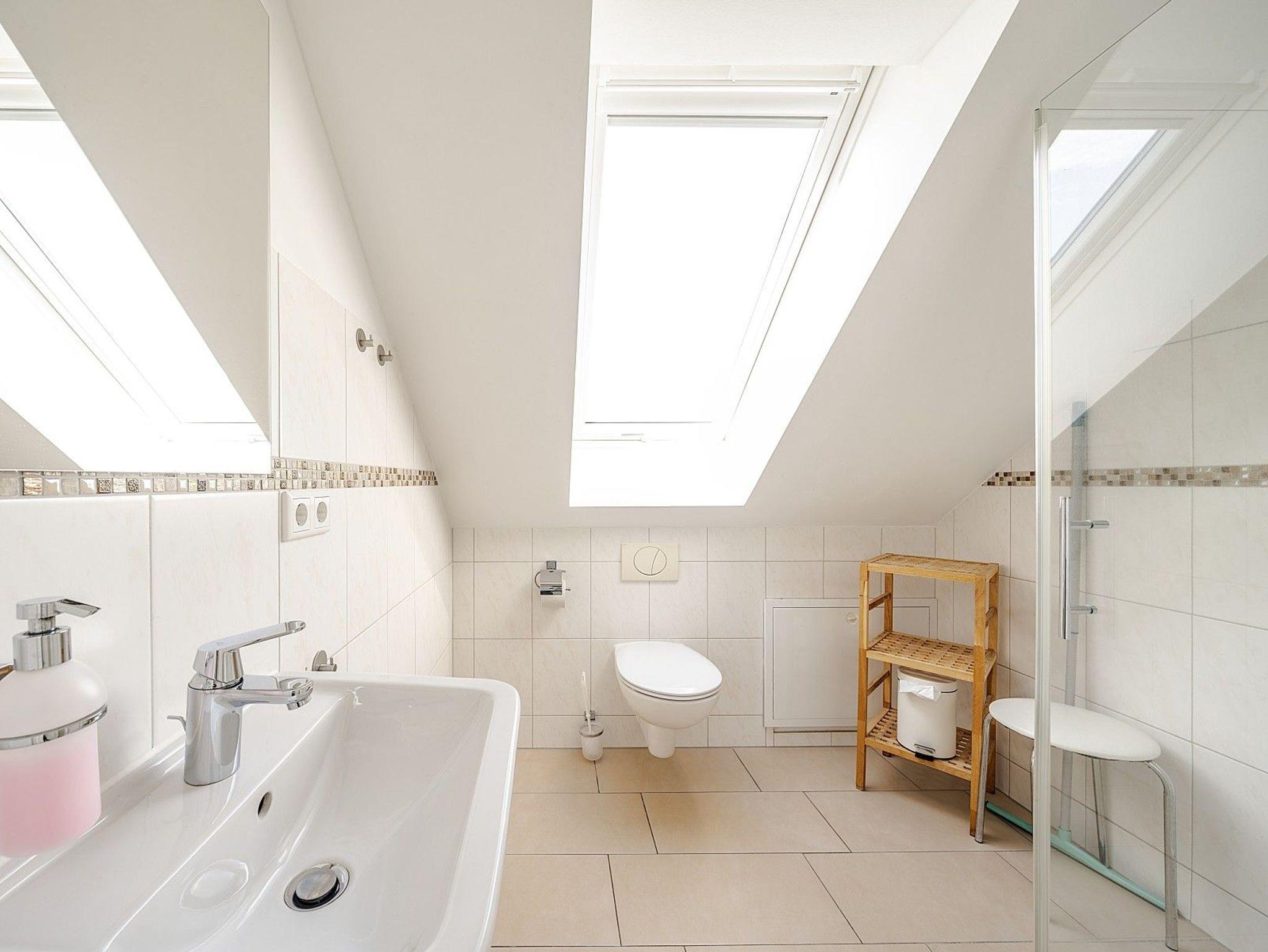 Die 6 Schlafzimmer verteilen sich auf zwei Etagen. Im Dachgeschoss befinden sich drei großzügige Doppelzimmer, jeweils mit eigenem Bad und kleiner Teeküche. Im 1. Obergeschoss liegen drei weitere Schlafzimmer, die sich ein großes Bad mit XXL-Dusche und Badewanne sowie ein separates WC teilen. Die Wohnung verfügt über kostenloses WLAN und mehrere TV-Geräte. Zwei kostenfreie Parkplätze befinden sich in der Nähe, weitere Stellplätze sind auf einem Großparkplatz (ca. 500m) verfügbar.