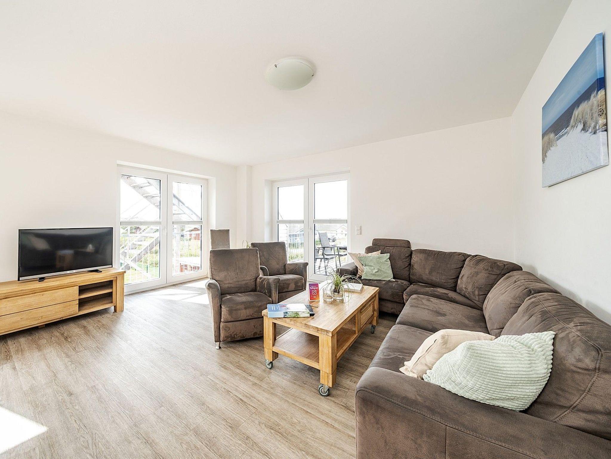 Das Herzstück der Wohnung ist der große Wohnbereich mit Esstisch für alle Gäste und gemütlicher Sofaecke. Von hier aus gelangen Sie auf den Balkon mit Westausrichtung ? ideal, um im Liegestuhl die Abendsonne und den Blick bis zur Nordsee zu genießen. Eine private Sauna mit Panoramablick sorgt für Entspannung an kühleren Tagen. Die voll ausgestattete Küche macht die Selbstversorgung einfach, eine Spülmaschine übernimmt den Abwasch.