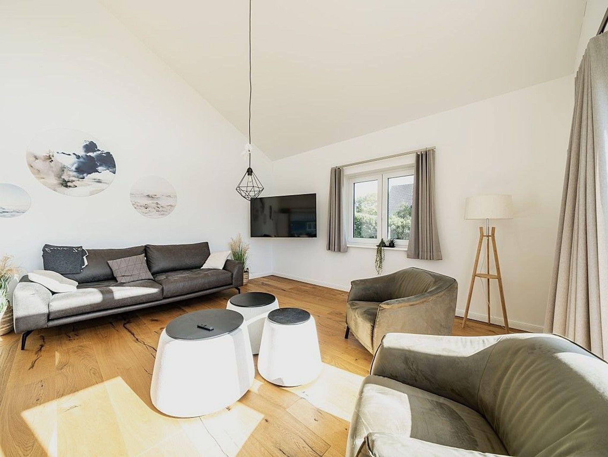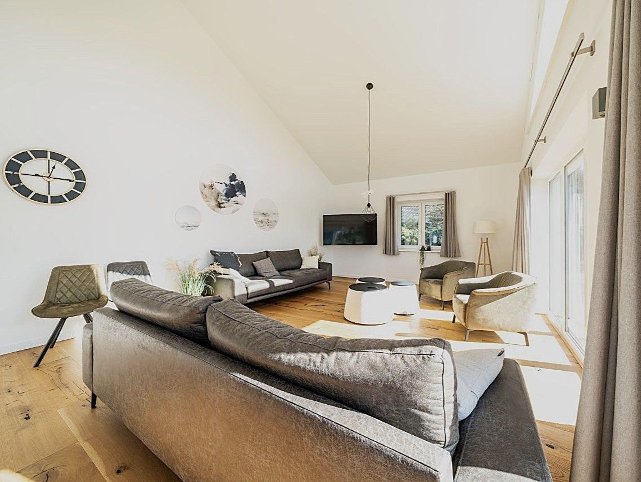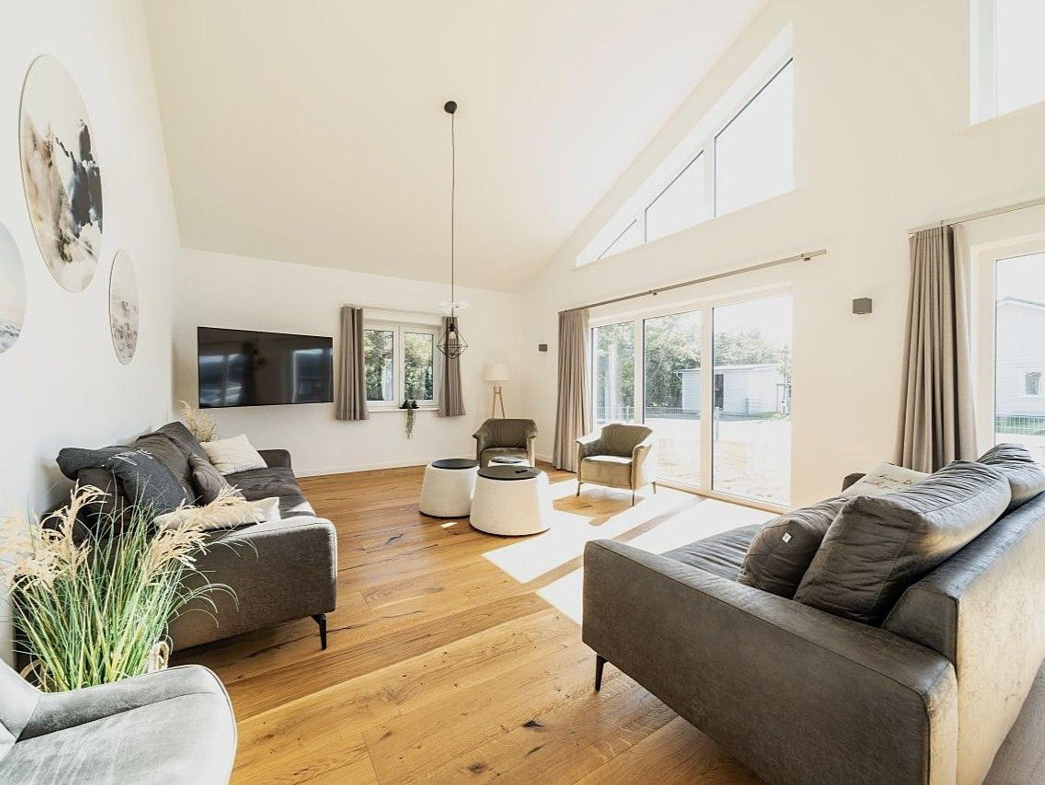 Der weitläufige Wohnbereich mit großen Fensterfronten schafft eine helle, freundliche Atmosphäre und lädt zum gemeinsamen Kochen, Essen und Entspannen ein. Sechs Schlafzimmer und vier moderne Bäder bieten Komfort und Rückzugsmöglichkeiten für alle Gäste. Nach einem Tag am Meer sorgt die hauseigene Sauna für wohlige Entspannung.