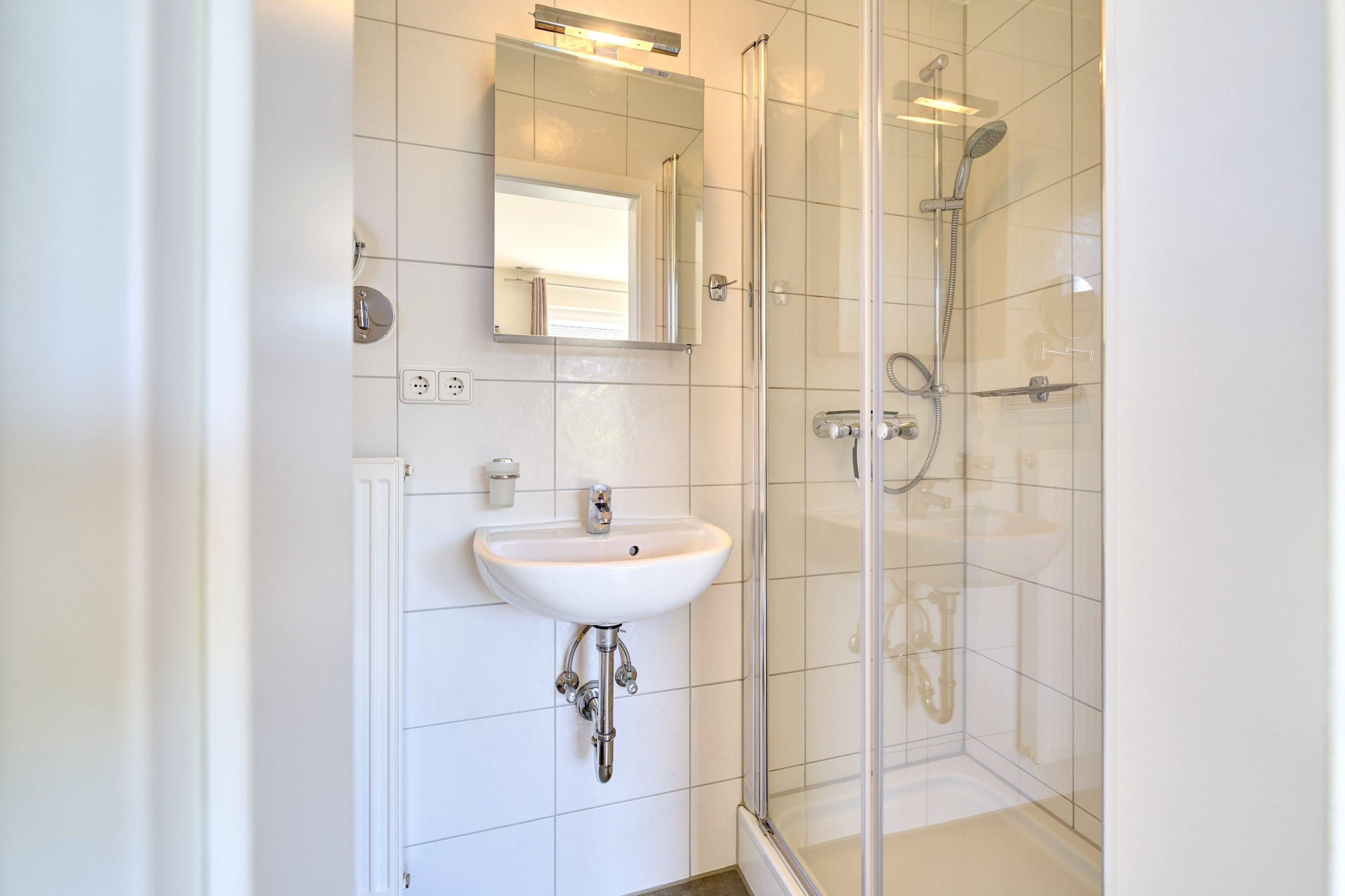 Das moderne Badezimmer mit Dusche, WC und Föhn lässt Sie frisch und entspannt in
