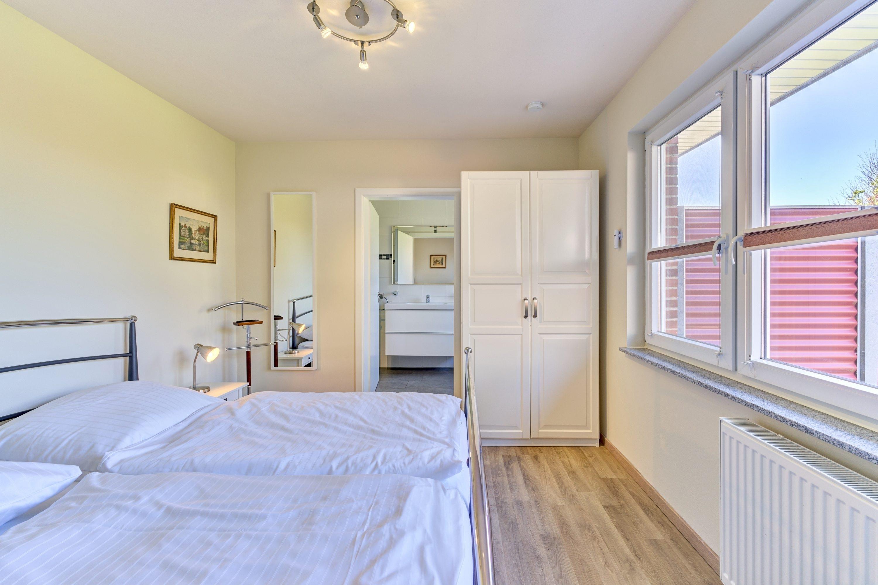 Das Schlafzimmer ist mit Doppelbett (180 × 200 cm), Kleiderschrank und 32-Zoll-SAT-TV