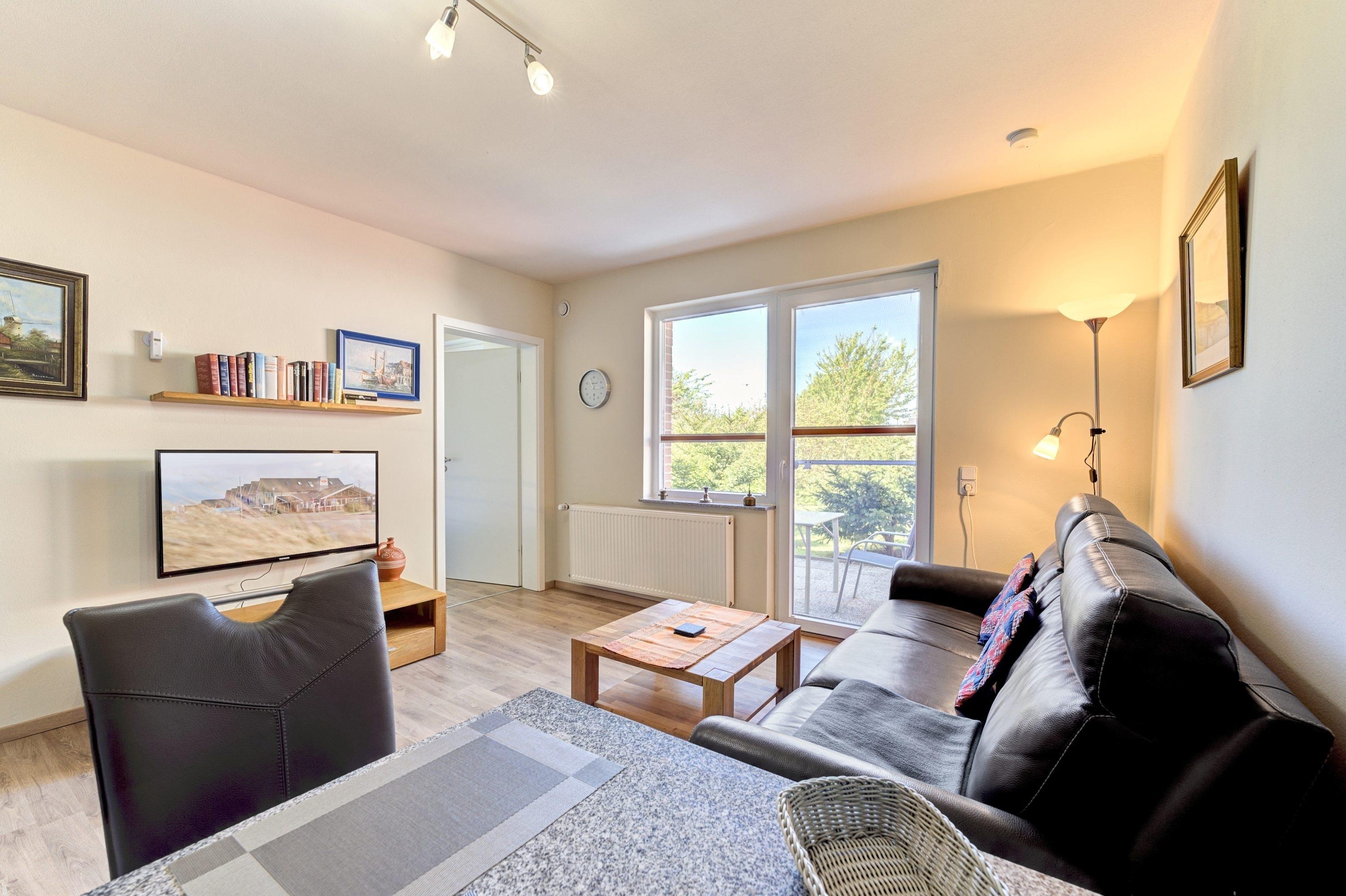 Das Wohnzimmer ist ausgestattet mit einem Ledersofa mit Relaxfunktion, einem 39-Zoll-SAT-TV und kostenlosen WLAN, perfekt für entspannte Abende.