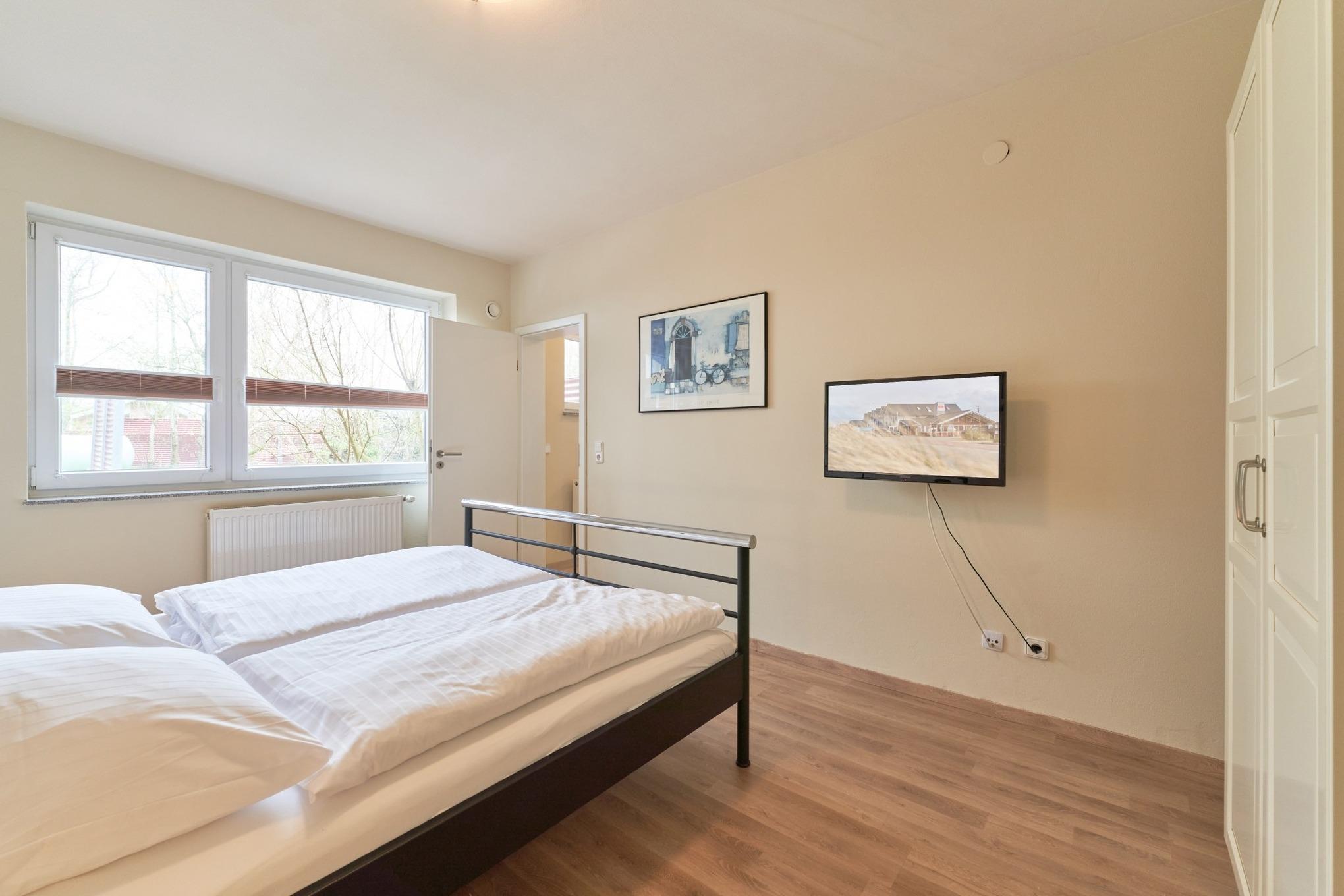 Im Schlafzimmer erwartet dich ein Doppelbett (180 × 200 cm), ein Kleiderschrank und ein