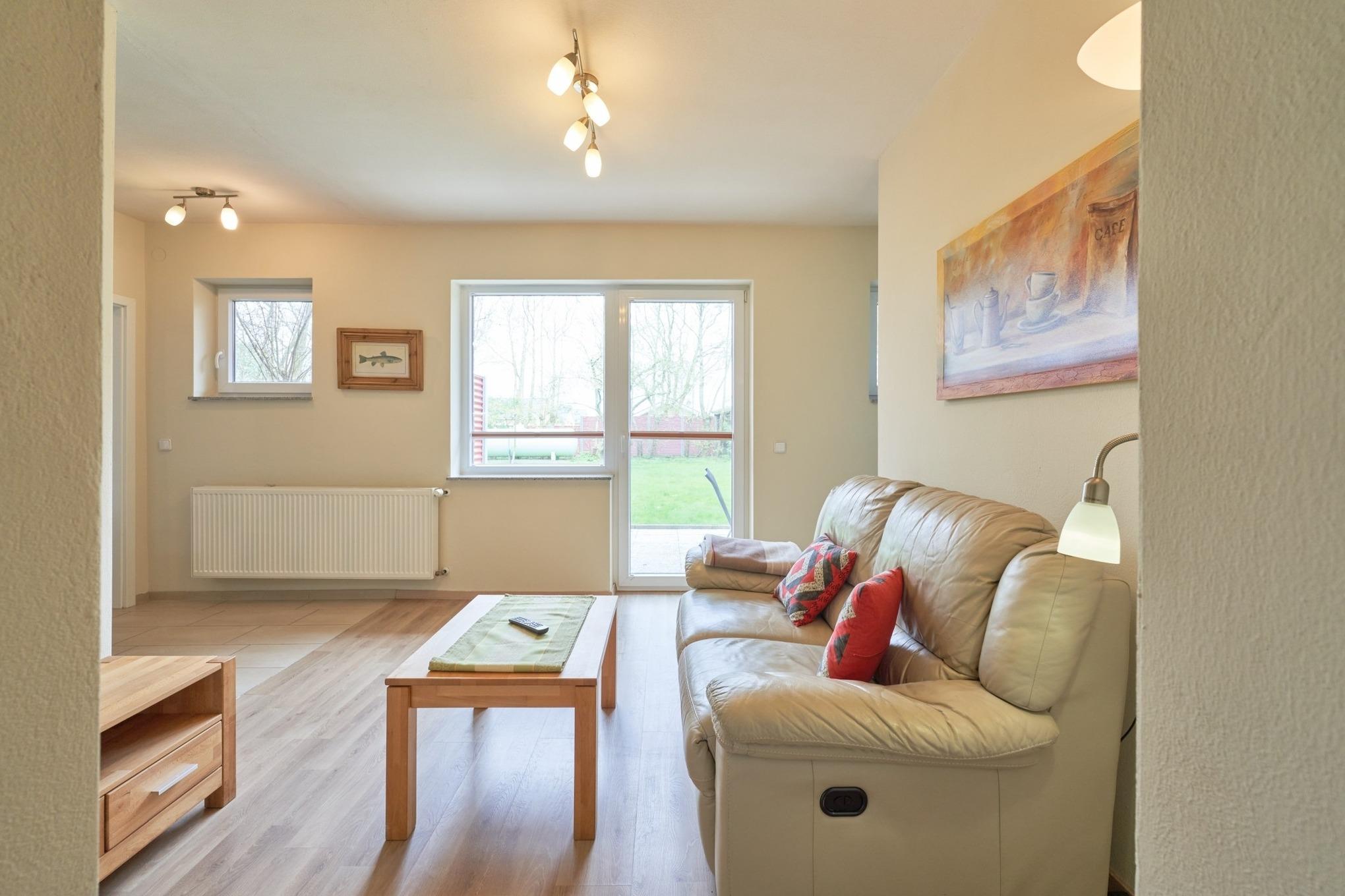Im Wohnzimmer lädt das Ledersofa mit Relaxfunktion dazu ein, die Füße hochzulegen, ein gutes