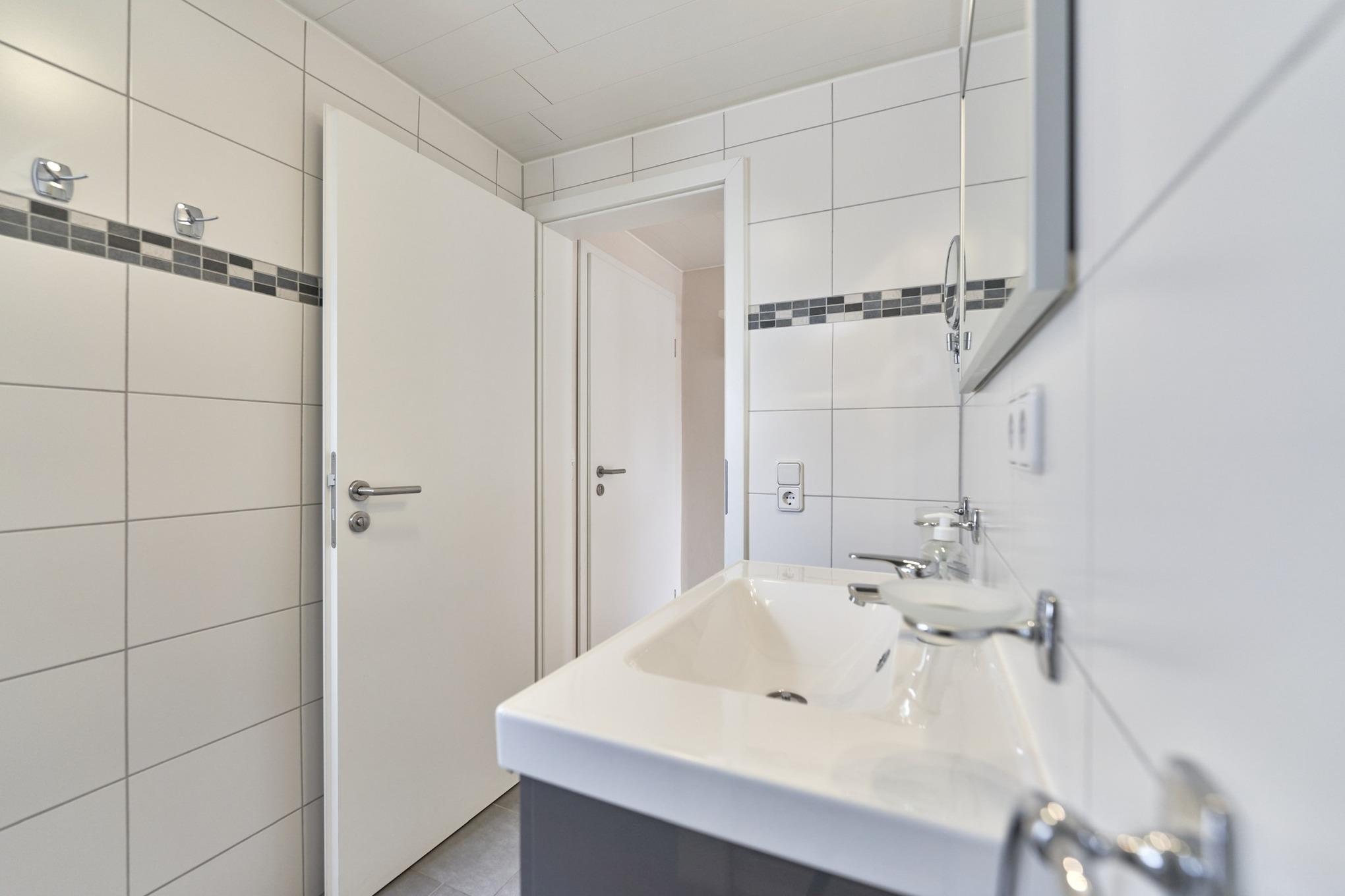 Das Badezimmer ist modern ausgestattet mit Dusche, WC und Föhn – für einen frischen Start in den Tag.