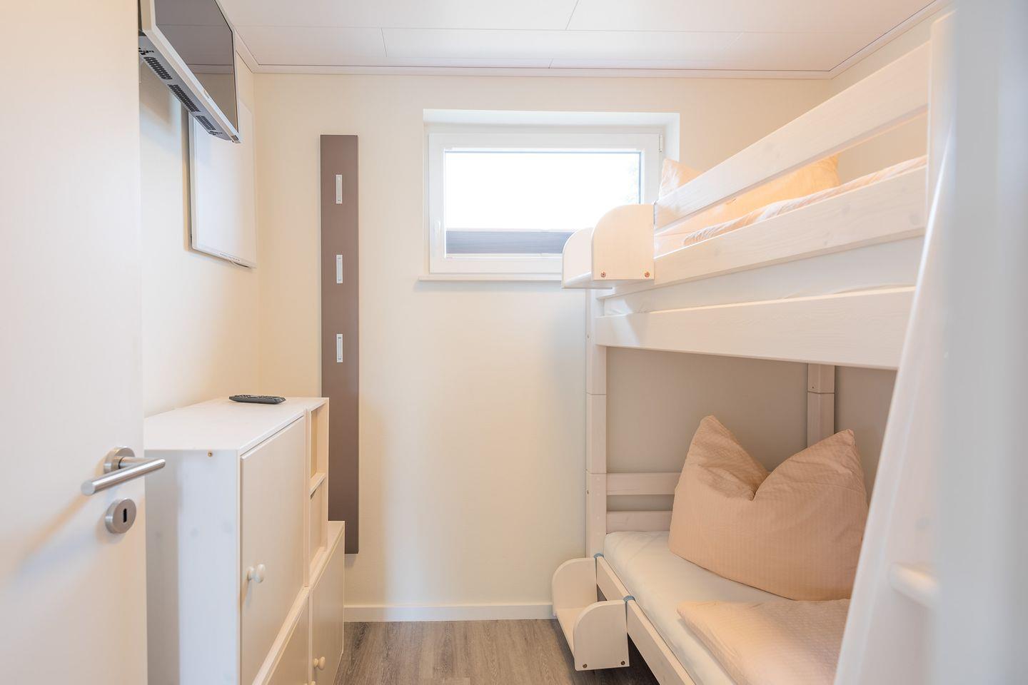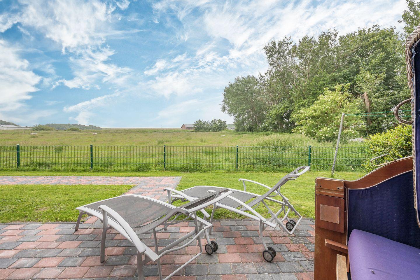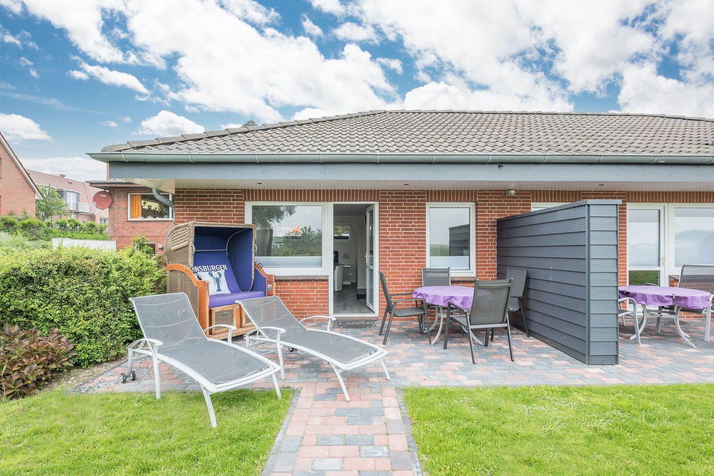 Die Wohnung ist mit allem eingerichtet, was Sie für einen erholsamen Urlaub in Strandnähe benötigen: ein Schlaf/Wohnbereich mit einem bequemen Boxspringbett und SAT-TV, ein Schlafzimmer mit einem Etagenbett, gut ausgestattete, separate Einbauküche mit Ceranfeld, Backofen, Mikrowelle. Vom Essplatz aus genießen Sie den Blick über die Felder bis zum Deich. Auf der Terrasse können Sie den Tag auf Gartenmöbeln, den Liegen oder auch im Strandkorb genießen.