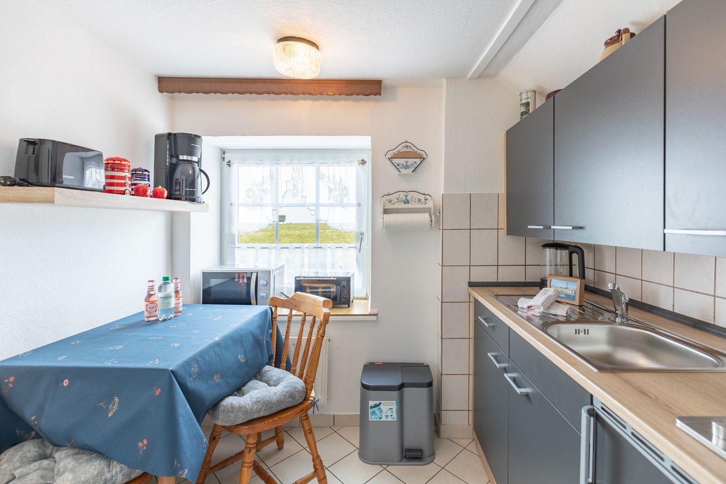 Das ca. 37 qm große Studio-Apartment ist einfach, aber mit allem Notwendigen eingerichtet. Die Pantry-Küche bietet Ihnen einen 2-Platten-Herd, einen Elektrogrill, einen Kühlschrank mit Gefrierfach, Mikrowelle, eine Kaffeemaschine (Filtergröße 4), Toaster, Wasserkocher und Geschirr. Der Wohnbereich ist mit einem bequemen Sofa ausgestattet. Der SAT-TV und WLAN bieten Ihnen Unterhaltung auch im Urlaub.