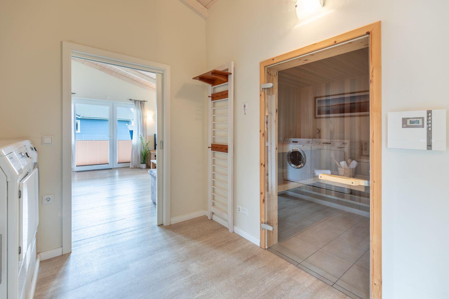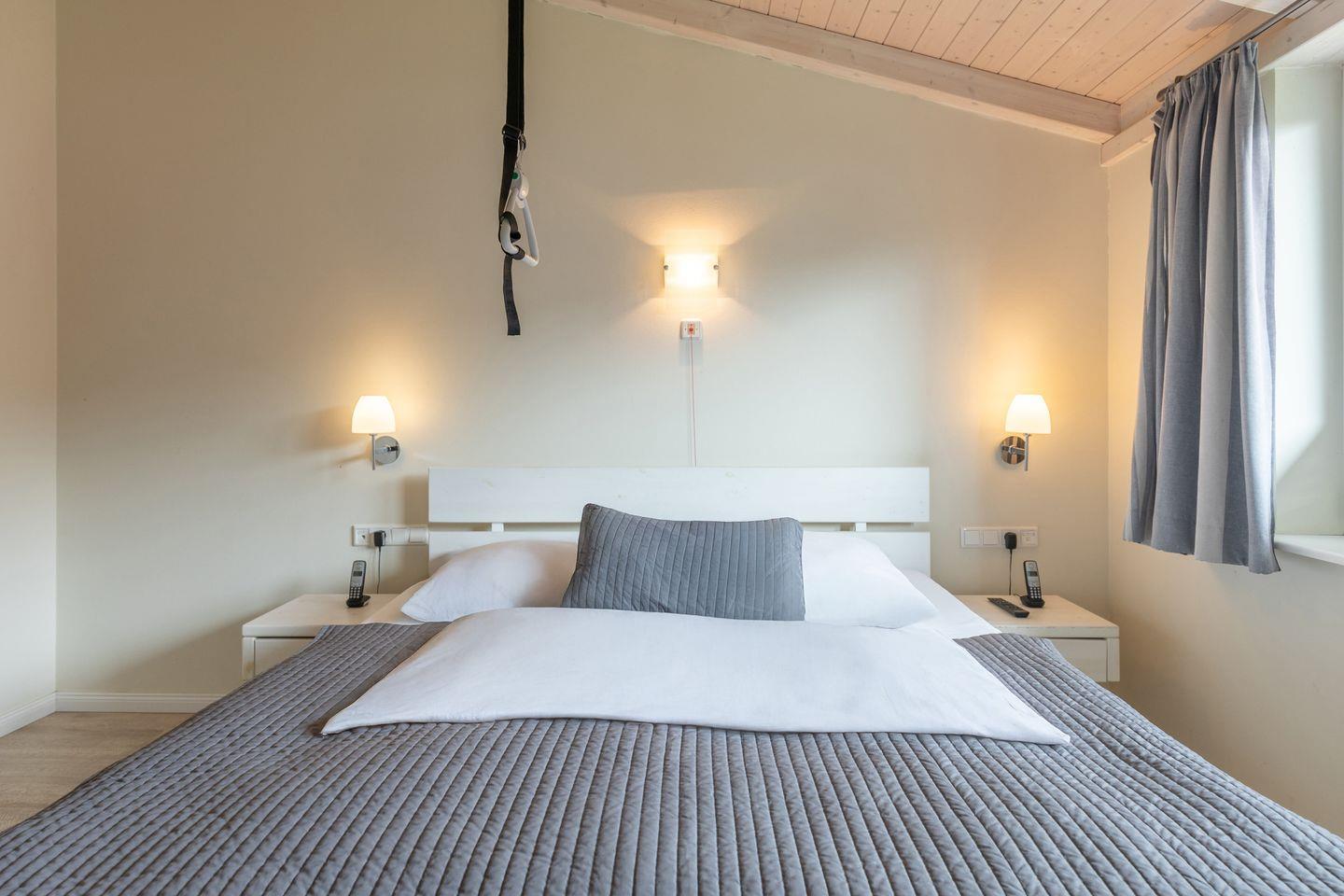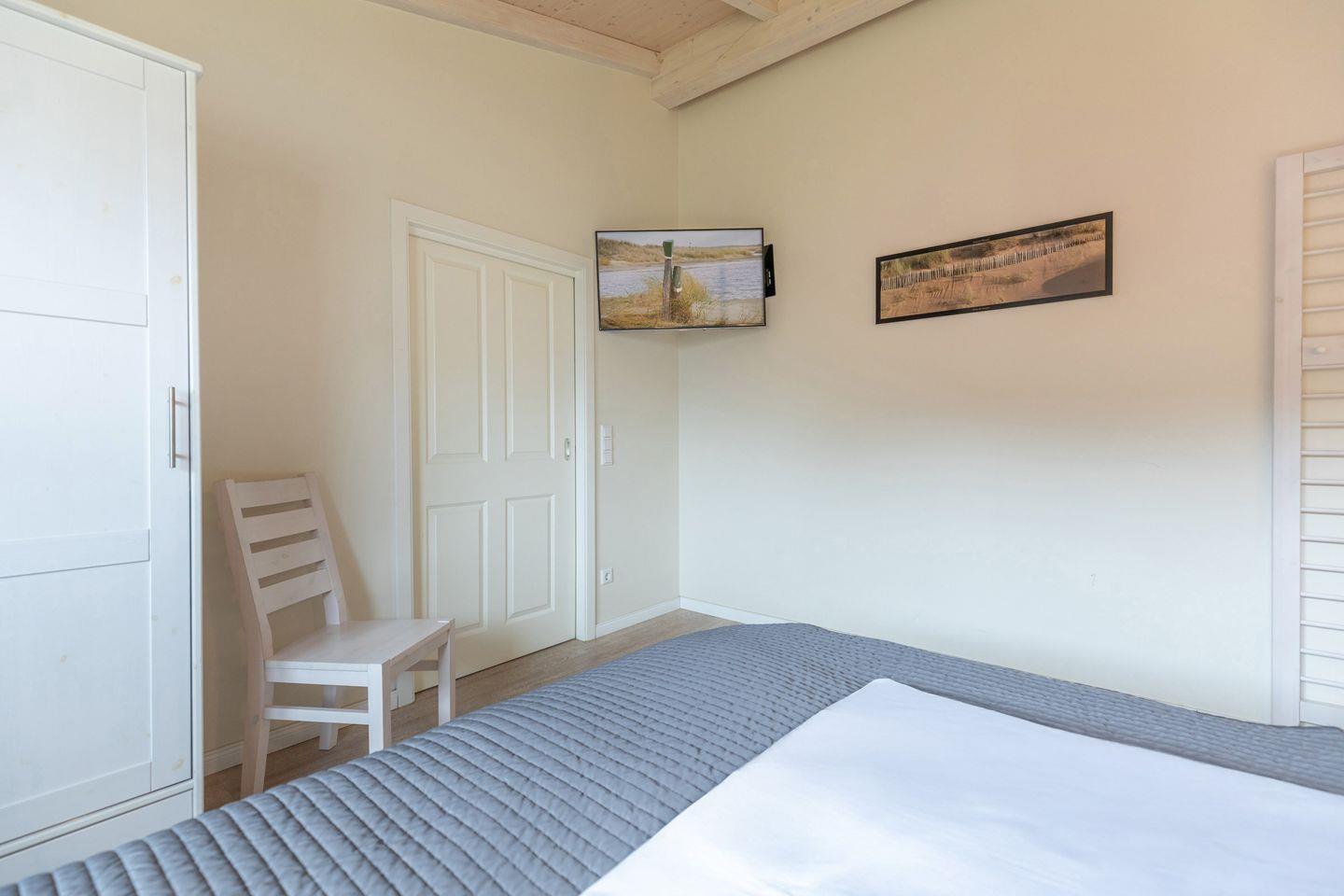 Das 90 qm große Ferienhaus ist modern und exklusiv im skandinavischen Charme eingerichtet. Die zwei Schlafzimmer mit jeweils einem Komfort-Doppelbett (180 x 200 cm) bieten Platz für bis zu vier Personen. In dem einen Schlafzimmer ist der Lattenrost elektrisch verstellbar und mit einem Lifter unterfahrbar. In den Schlafräumen, der Sauna und im Badezimmer befindet sich ein Notrufsystem. Beide Schlafzimmer sind mit einem Fernseher ausgestattet.