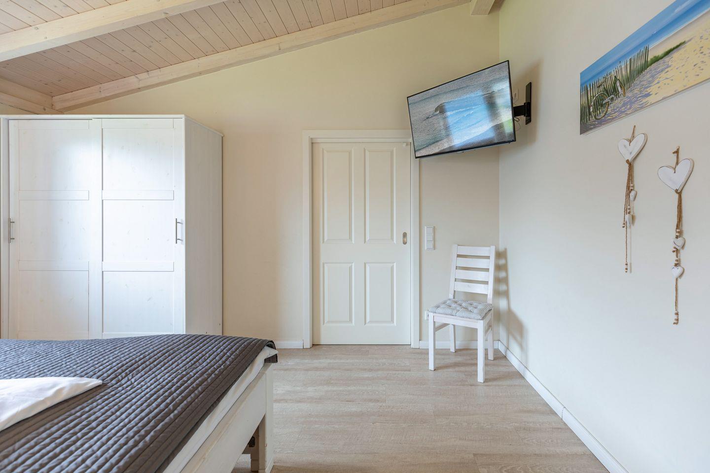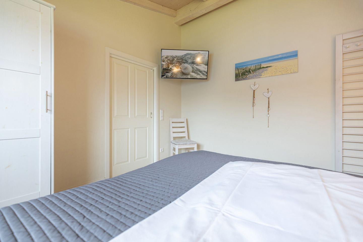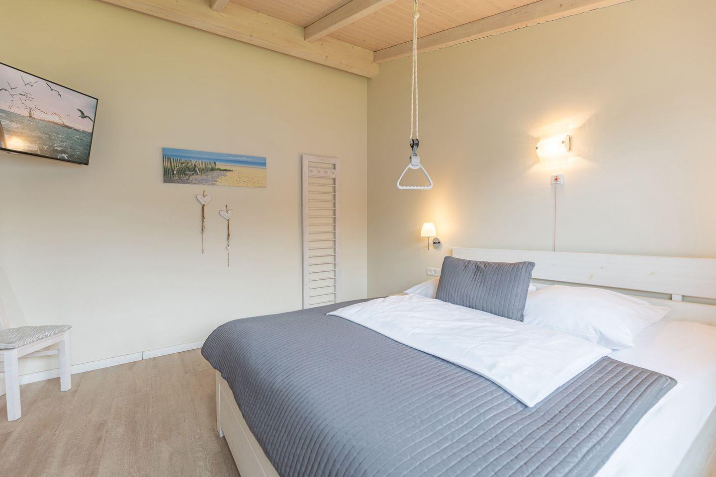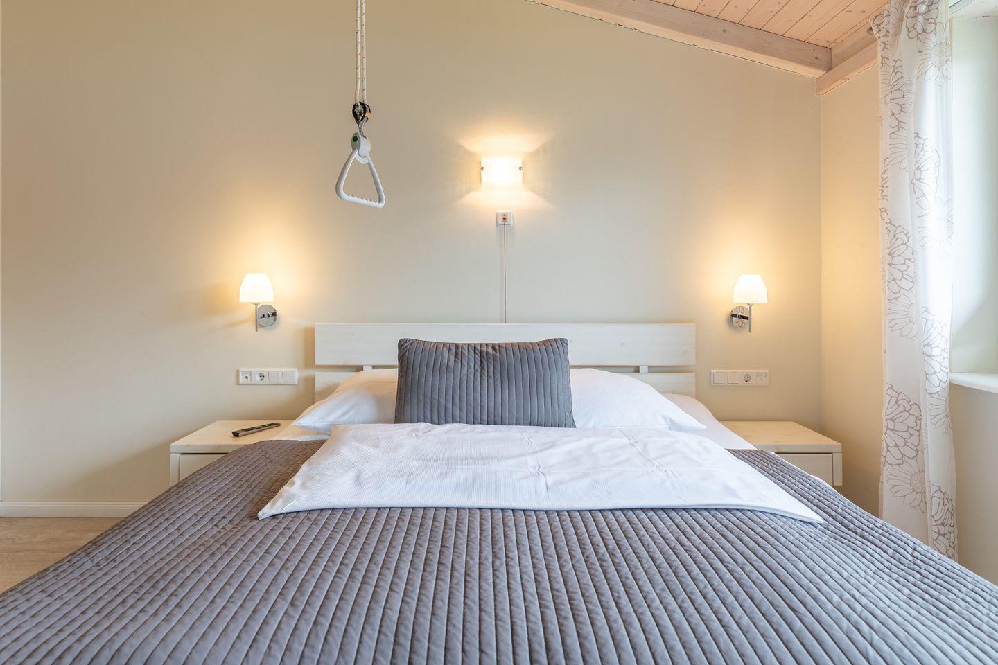 Das 90 qm große Ferienhaus ist modern und exklusiv im skandinavischen Charme eingerichtet. Die zwei Schlafzimmer mit jeweils einem Komfort-Doppelbett (180 x 200 cm) bieten Platz für bis zu 4 Personen. In dem einen Schlafzimmer ist der Lattenrost elektrisch verstellbar und mit einem Lifter unterfahrbar. In den Schlafräumen, der Sauna und im Badezimmer befindet sich ein Notrufsystem. Beide Schlafzimmer sind mit einem Fernseher ausgestattet.